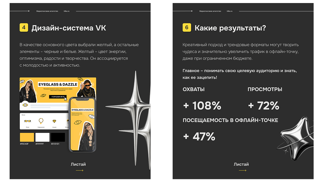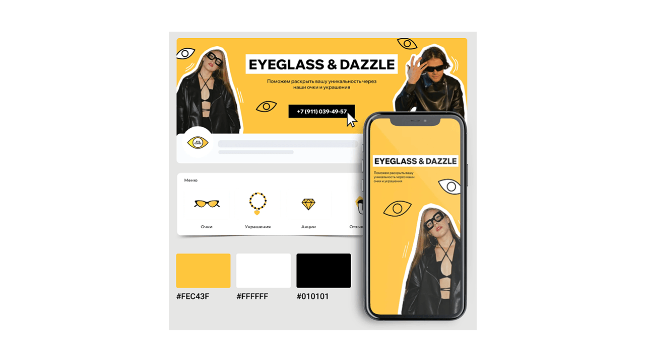 В качестве основного цвета выбрали желтый, а остальные элементы – черные и белые. Желтый – цвет энергии, оптимизма, радости и творчества. Он ассоциируется с молодостью и активностью. Кроме того, желтый цвет отлично контрастирует с черным и белым, что делает контент более читабельным и акцентирует важные элементы.