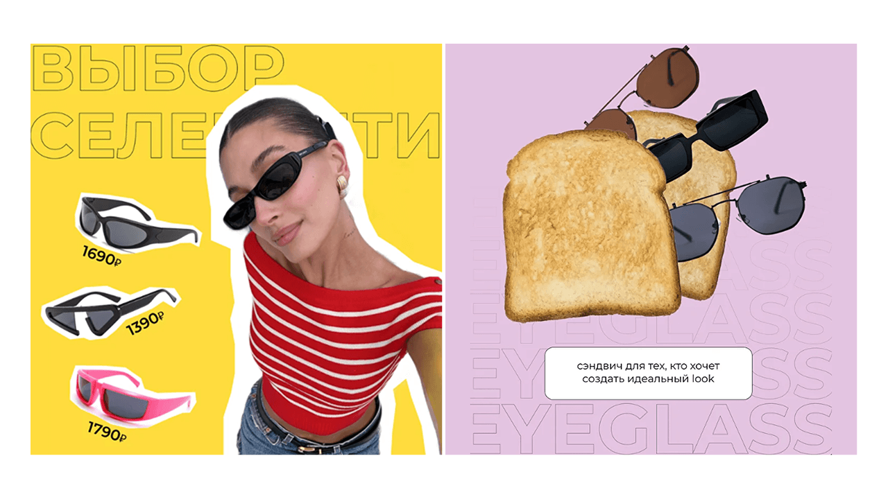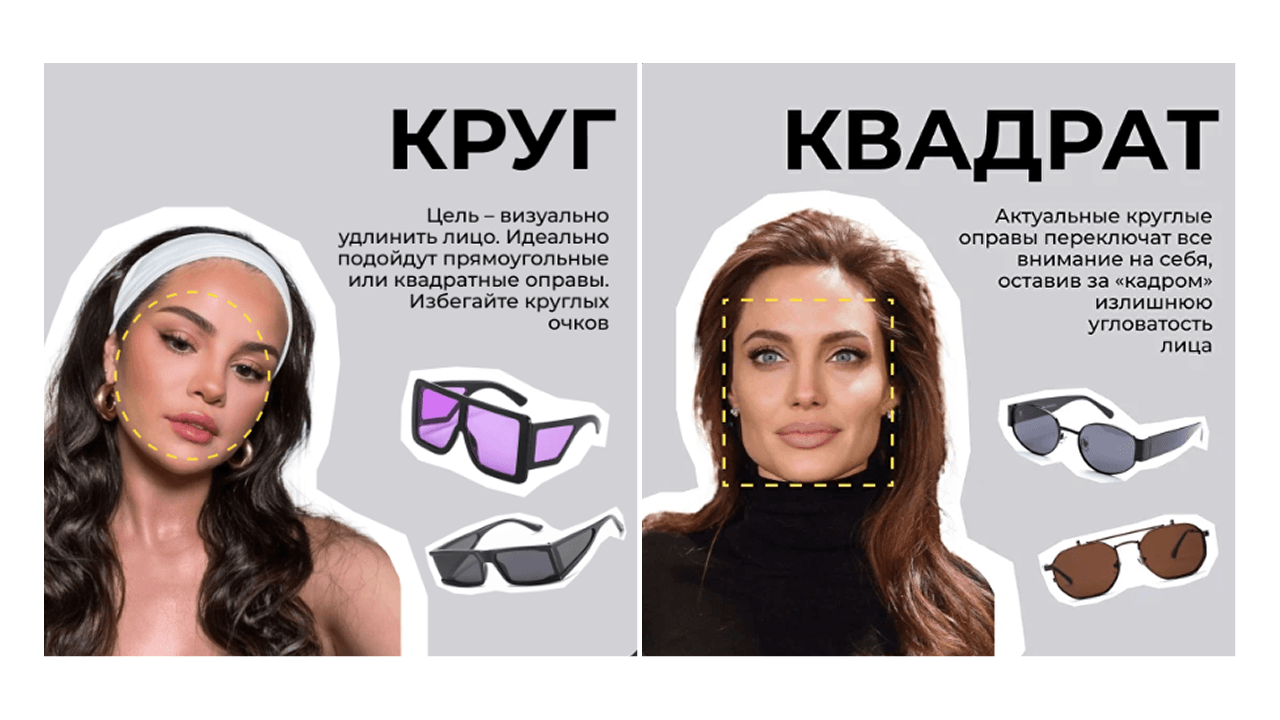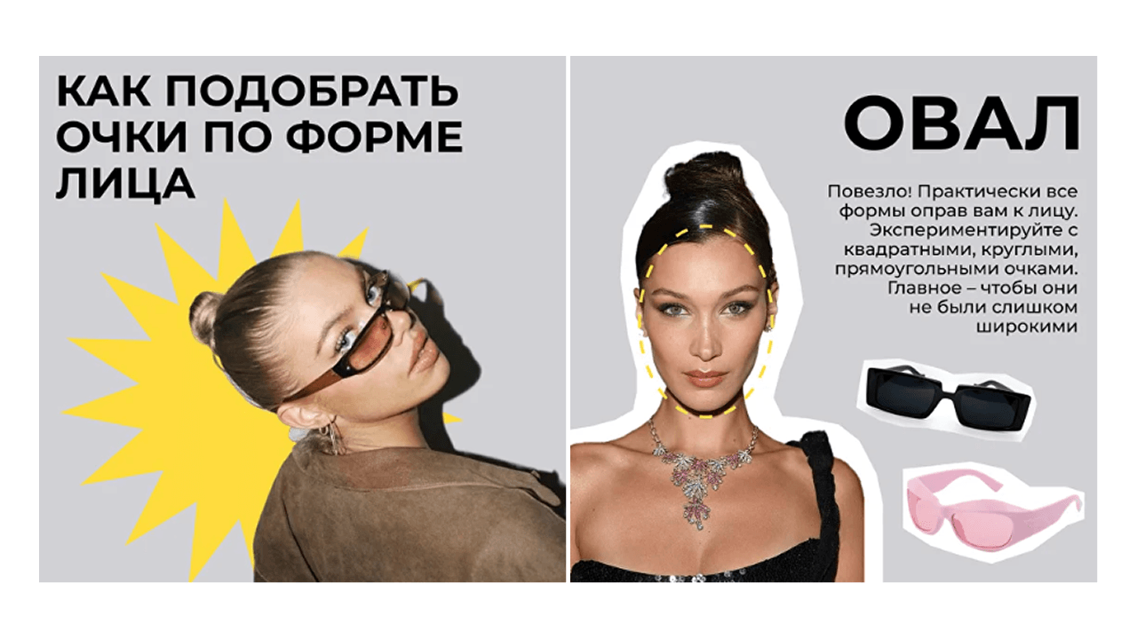 3) Выбрать аксессуары онлайн – задача не из лёгких. Часто бывает сложно представить, подойдёт ли та или иная вещь именно вам. Чтобы упростить этот процесс, мы давали аудитории рекомендации по выбору очков в зависимости от формы лица. И вместо скучных, общих советов мы использовали образы любимых селебрити в качестве наглядных примеров.