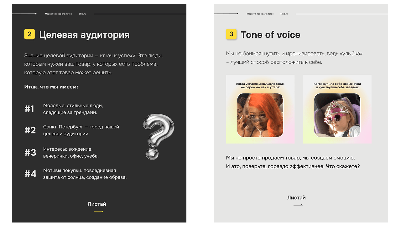 Это помогает нам сформулировать ключевые преимущества продукта. Мы не просто продаем очки, мы продаем комфорт, стиль, уверенность в себе.