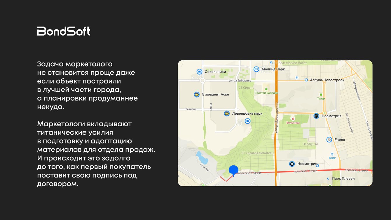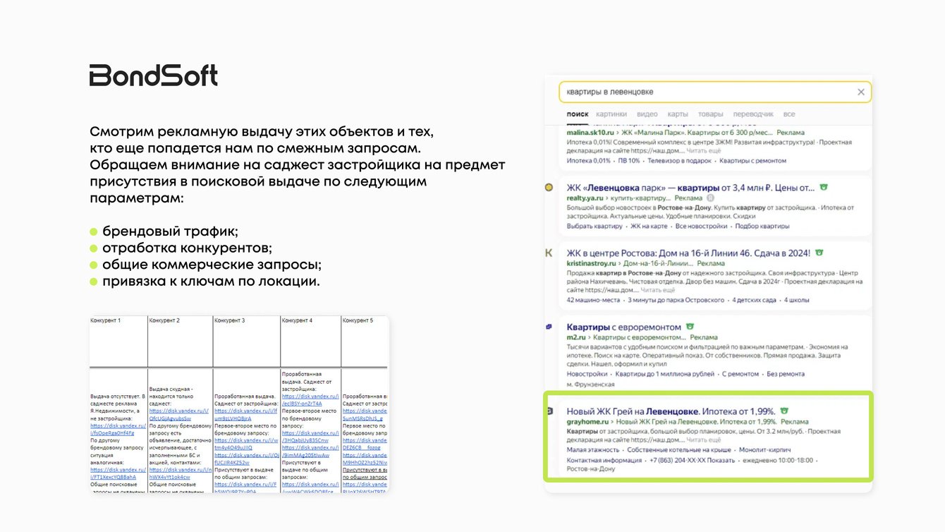 Мы начали с подбора конкурентов в одной локации и собрали полное досье на каждого из них. Сравнили сайты, объявления в Директе, креативы, офферы. Разложили их маркетинг по полочкам: от отделки квартир до того, какие банки указаны в ипотечных условиях.