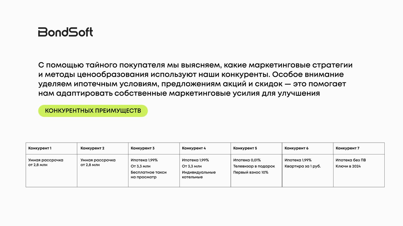 Сравнили ценовые предложения, политику скидок, подачу ипотечных условий. Здесь сработал даже не сам процент, а то, как его презентовали. Понравился пример: менеджер заранее озвучил пример расчётов — это снижает тревожность клиента и помогает принять решение быстрее.