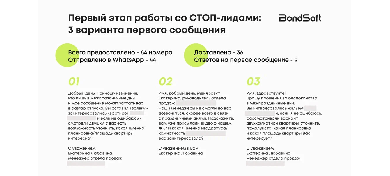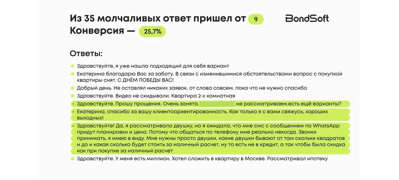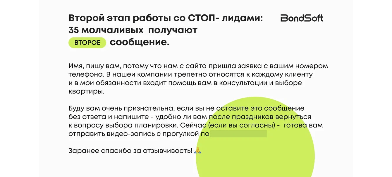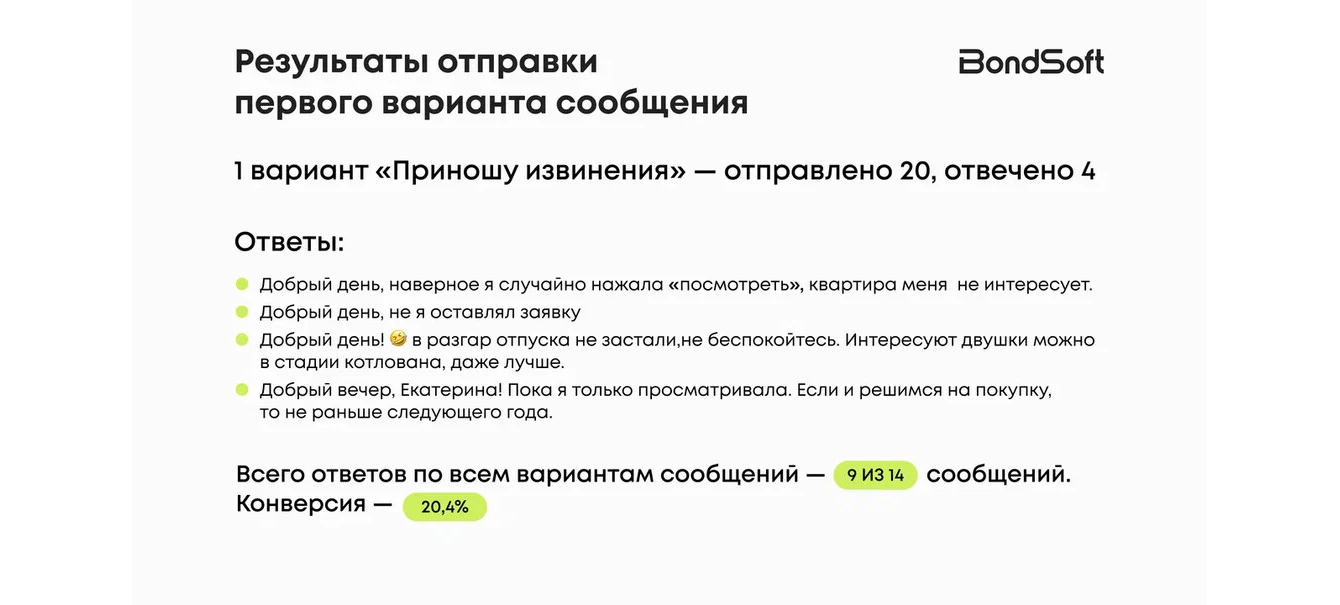 Оставшимся 35 отправили второе сообщение. Мы поменяли формулировку, предложили подборку, уточнили: “Может, сейчас не самый подходящий момент, но вы всё ещё рассматриваете покупку?”