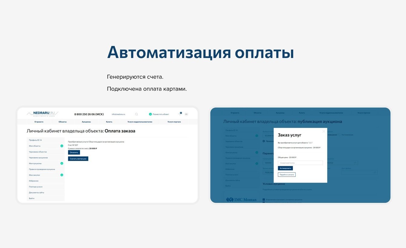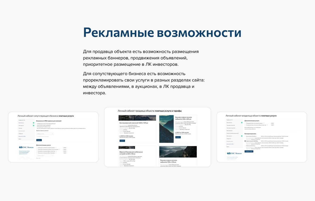 — Личные кабинеты для трех уровней пользователей с разными возможностями: Владелец объекта, Инвестор, Сопутствующий бизнес.