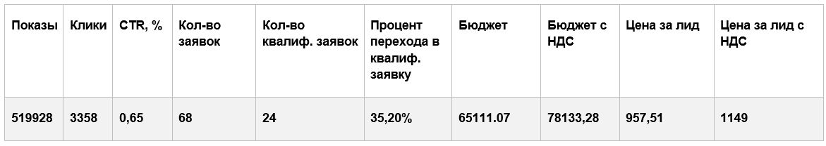Хотя уровень конверсии из кликов в заявки немного снизился до 2,02%, он все же демонстрирует, что рекламные меры начали приносить результаты. При этом CTR достиг 0,65%, что даже превышает целевой показатель.