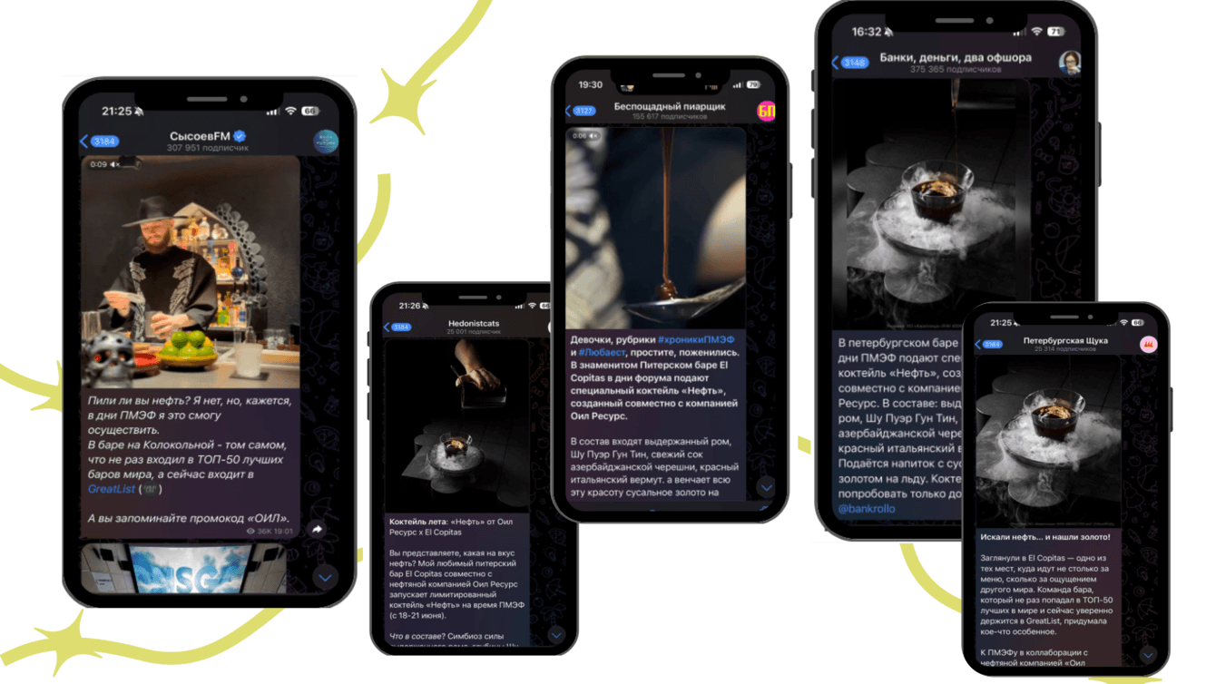 В дни ПМЭФ агентство реализовало диджитал-кампанию: Telegram-каналы, работающие на стыке бизнеса, культуры и лайфстайла, рассказали о «Нефти» как о неожиданной и концептуальной коллаборации. В их числе — «Банки, деньги, два офшора» (376 637 подписчиков), «Беспощадный пиарщик» (155 744 подписчиков), гастрономический канал «Петербургская ЩУКА» (25 644 подписчиков).