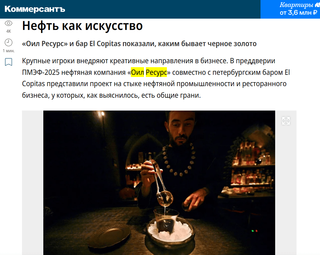 Финальный штрих — публикация в федеральном «Коммерсантъ. Сомелье». Издание представило запуск как пример смелого высказывания на стыке индустрии и культуры. Коктейль «Нефть» был подан как символ переосмысленной нефтяной эстетики и доказательство, что даже черное золото может стать объектом культурного высказывания.