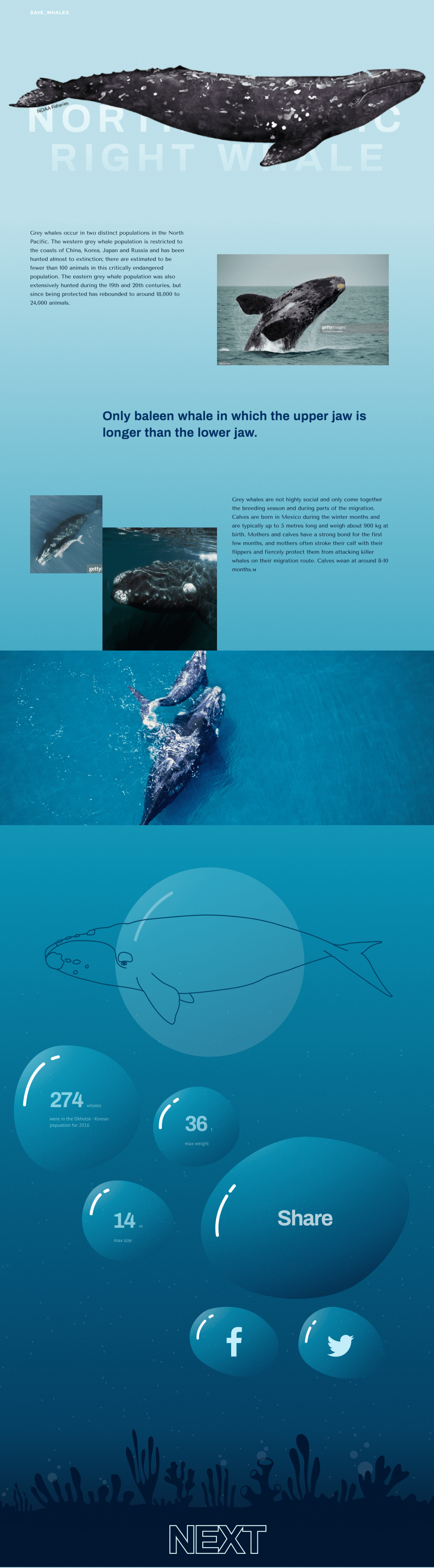 Все 3D-модели разработали с нуля: изучили массу фотографий, по ним детально нарисовали каждого кита и внедрили на сайт с помощью WebGL. Для ещё большей реалистичности добавили на страницы звуки, которыми общается каждый из видов. Животные «выплывают» на экран, пользователь может поворачивать их и рассматривать.