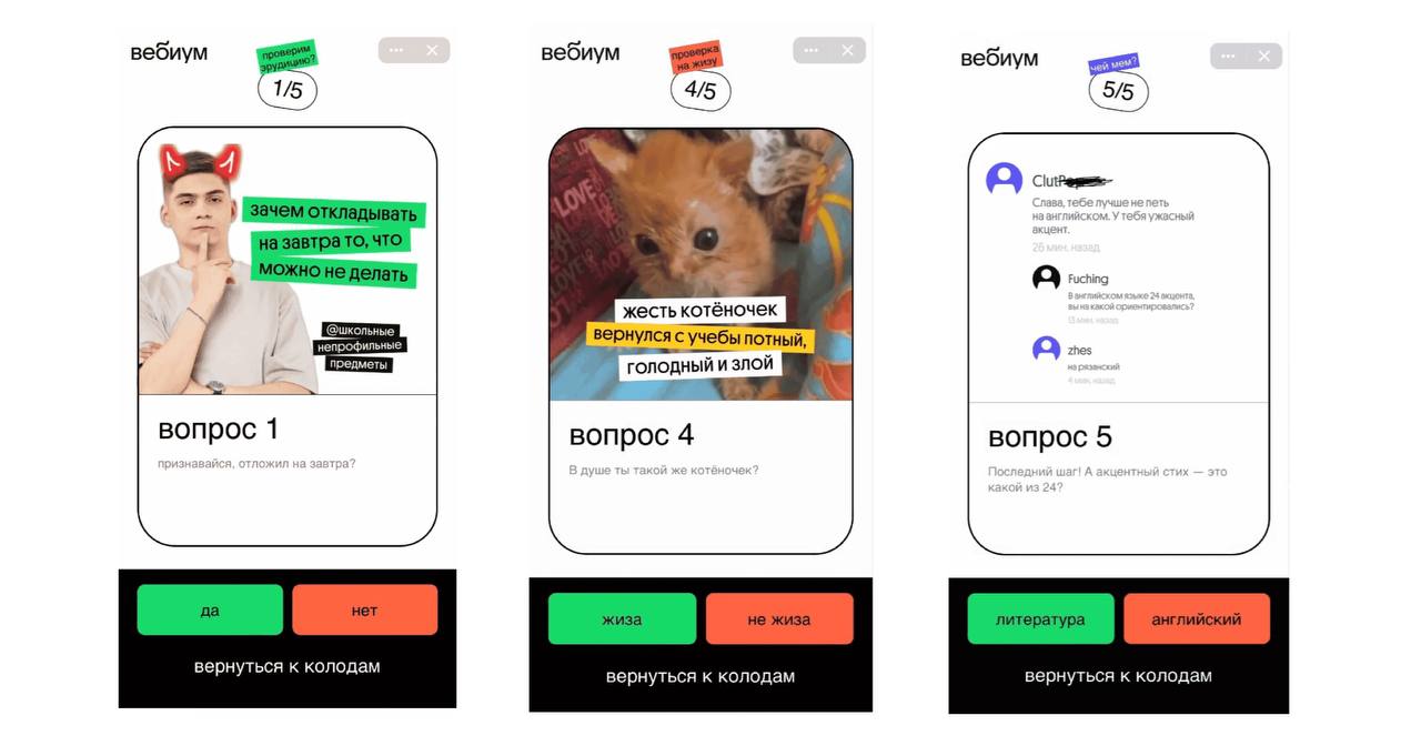 В чем суть: открывая одну из колод, ученики видели мемы один за одним. В зависимости от типа колоды, школьники отвечали на мемные вопросы в формате тиндерного «да-нет». За прохождение игры подростки получали доступ к бесплатному онлайн-курсу Вебиума.