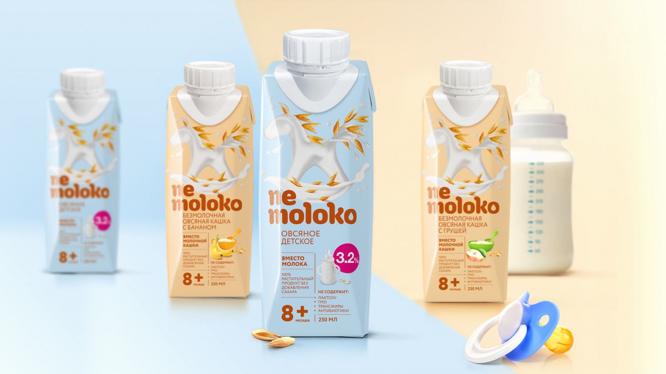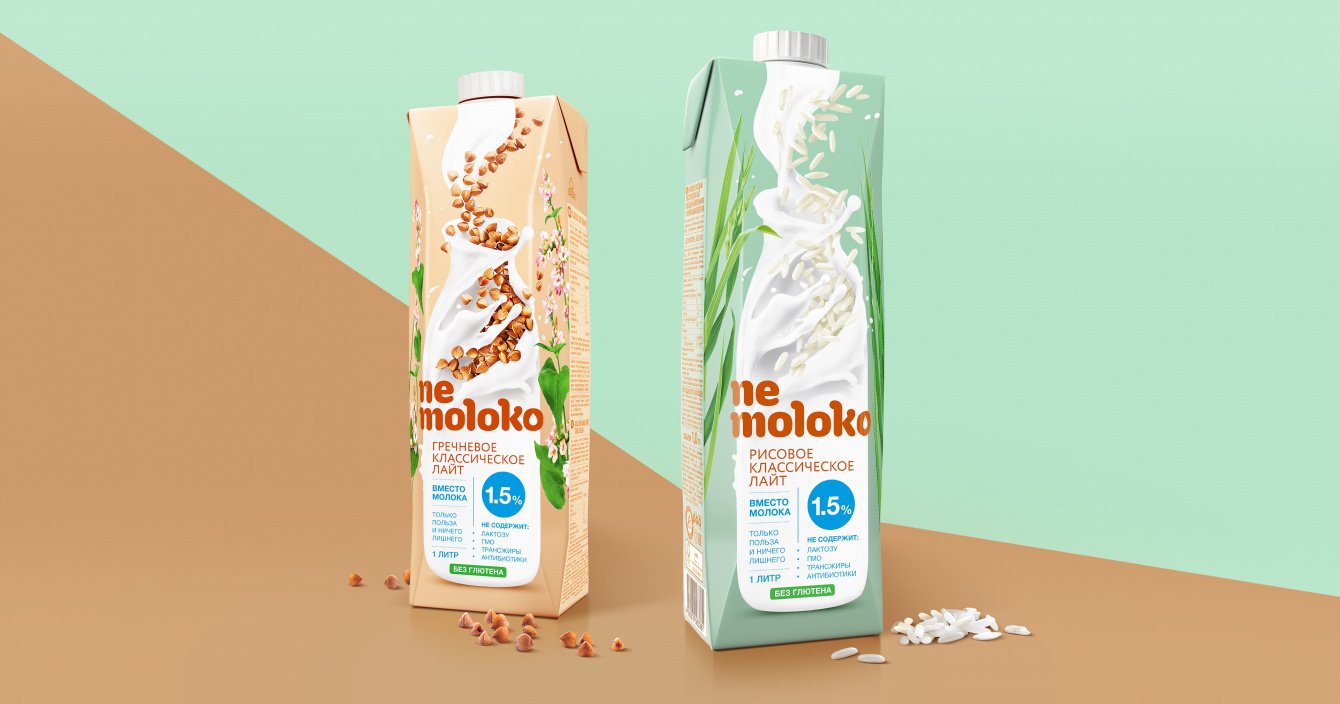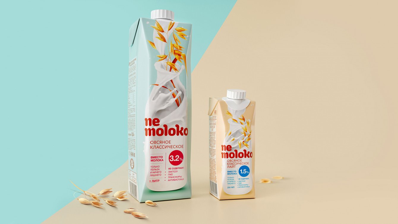Название новой линейки продуктов — «Nemoloko» — рациональное и интригующее, оно позволяет сразу дистанцироваться от молочных продуктов на полке, а главное подчеркивает выбранную идею и стратегию – “вместо молока, как молоко”. Разрабатывая дизайн упаковки, команда тестировала множество вариантов: более нишевые, более альтернативные, более революционные; в итоге, в соответствии с финальной выбранной стратегией, был выбран глубоко категорийный молочный дизайн, но с явным указанием на растительное происхождение. От нишевых решений дизайна мы должны были отказаться, так как продукт предназначен для повседневного потребления миллионов россиян, поэтому получившаяся упаковка делала продукт понятным и легко вписывала его покупку в стандартные потребительские привычки. При этом команда приняла решение отказаться от классических молочных атрибутов на упаковке: никаких коров, зеленых лугов, крынок и деревенских пейзажей. Было принято решение придерживаться минимализма, чистоты и лёгкости. Друг от друга продукты в линейке отличаются цветом и формой немолочной бутылки, поэтому ориентироваться в разных вкусах и видах «Nemoloko» потребителю должно быть легко. Название, упаковка, дизайн и коммуникации — все элементы бренда работают на привлечение внимания потребителя, делая продукт понятным и привычным и до сих пор успешно дистанциируют бренд от конкурентов на молочной полке.
