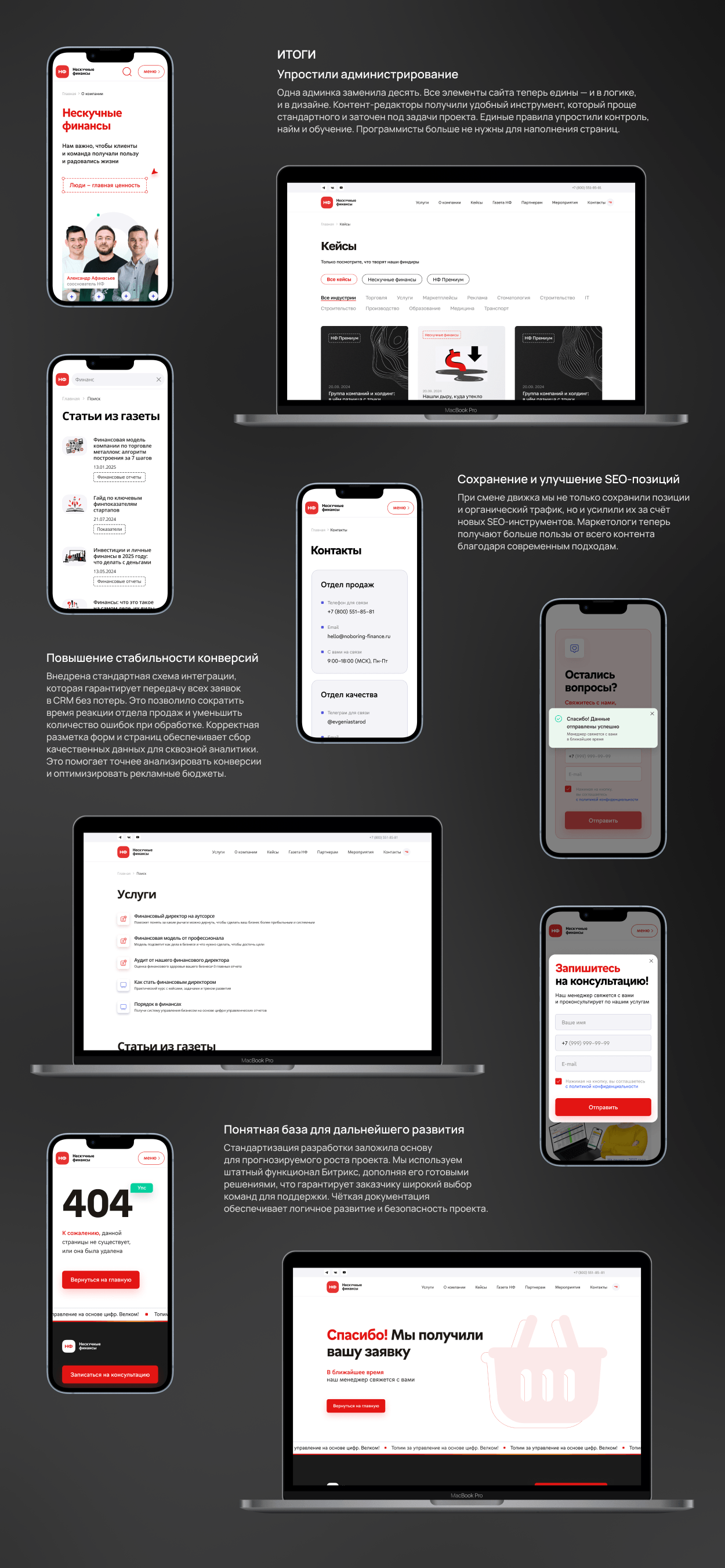 Для «Нескучных Финансов» сайт – один из основных инструментов для продвижения и получения заявок от клиентов. Мы сделали этот инструмент удобнее, стабильнее, быстрее, а также внедрили множество нестандартных решений, чтобы сотрудникам, работающим с сайтом, было удобнее. Поработав отдельно с конверсионными инструментами сайта, мы сделали комплексное решение более анализируемым и надежно работающим в связке с CRM-системой.