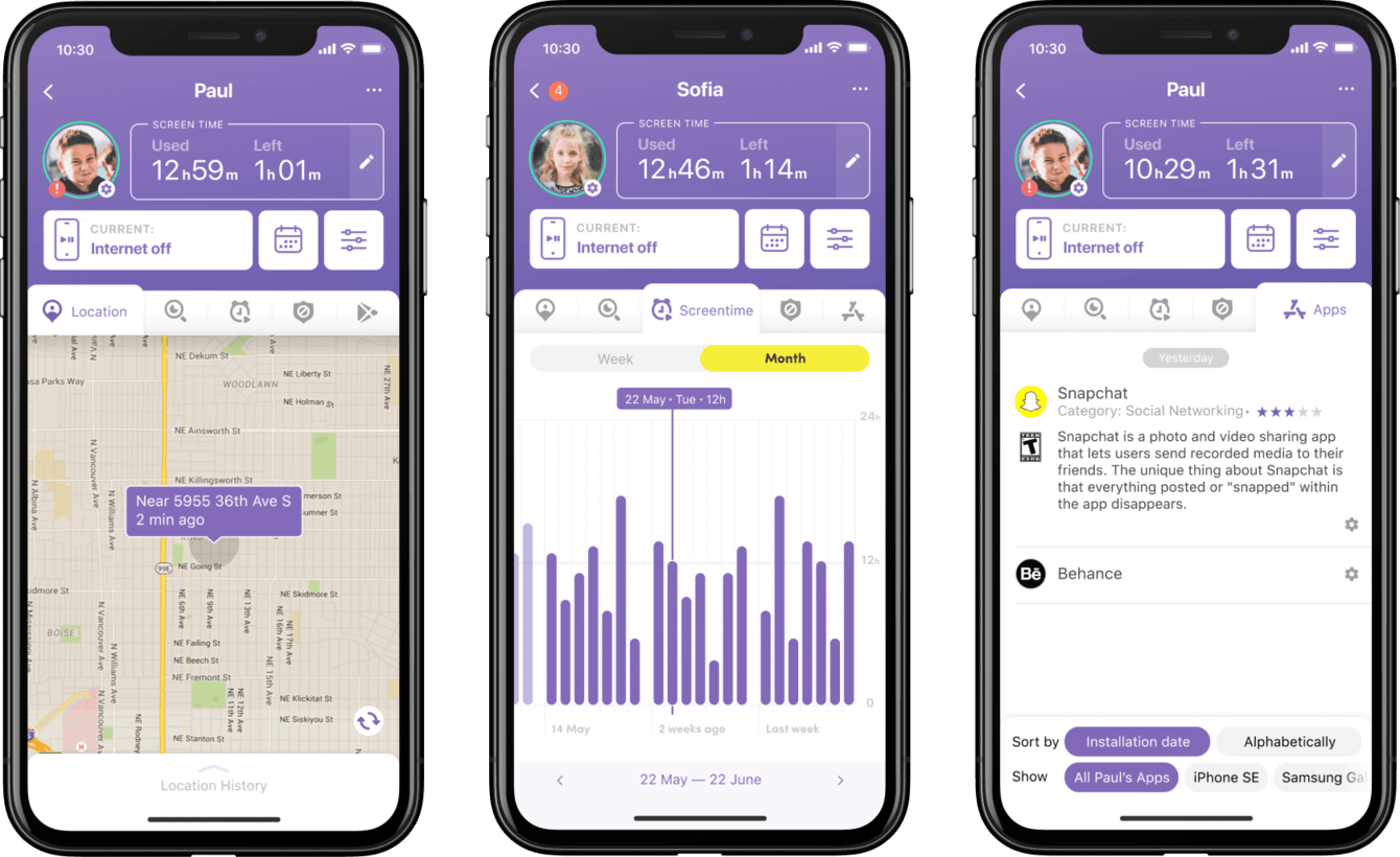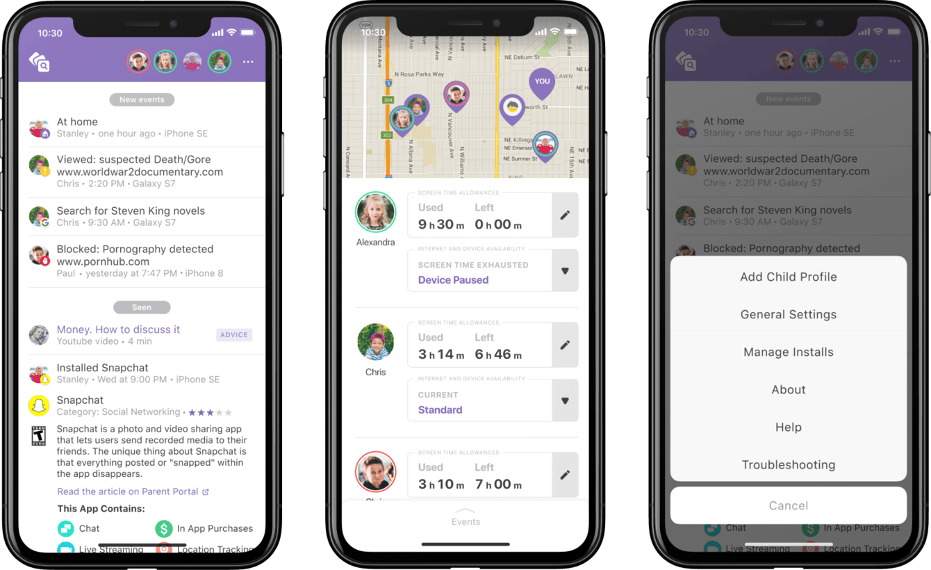 На главном экране приложения родители видят ленту событий по всем детям: какие приложения были установлены, поисковые запросы и когда ребёнок вернулся домой или добрался до школы. А свайп вниз по верхней панели с аватарами покажет карту с координатами всех детей.