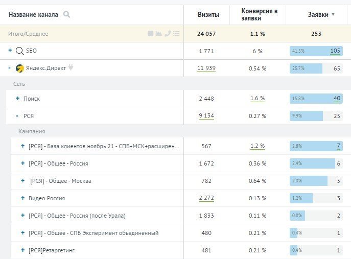 В марте соотношение заявок Поиск и РСЯ уже составило 37 и 54. И средняя цена заявки со всех кампаний снизилась уже до составила 3 500 руб.