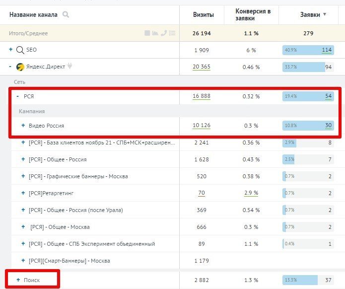 2. Было принято решение в течение 2-3 месяцев перераспределить соотношение количества заявок с поиска на РСЯ с целью снижения средней стоимостью лида. Главным инструментом для лидогенерации были выбраны видео кампании, нацеленные на продвижение конкретной продукции завода.