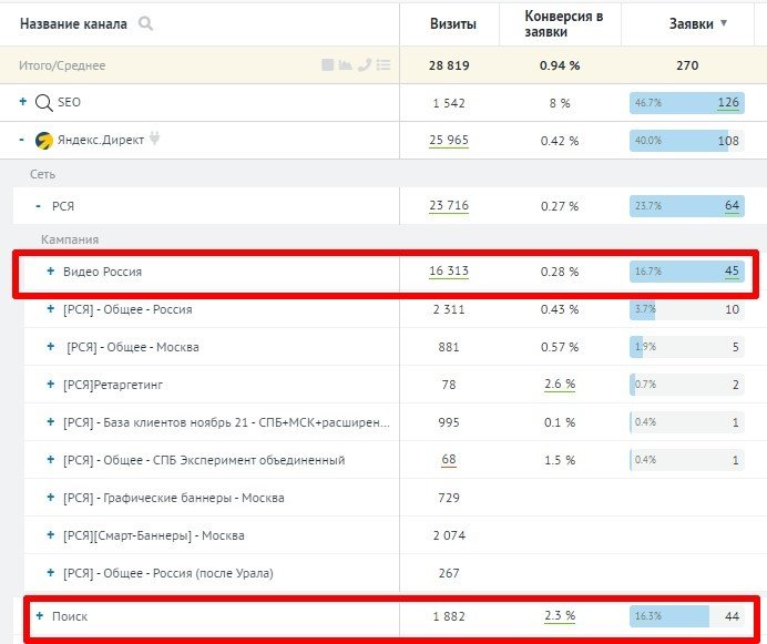 2. Было принято решение в течение 2-3 месяцев перераспределить соотношение количества заявок с поиска на РСЯ с целью снижения средней стоимостью лида. Главным инструментом для лидогенерации были выбраны видео кампании, нацеленные на продвижение конкретной продукции завода.