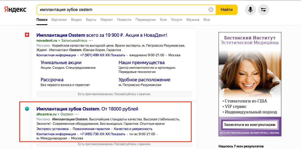 Снизить стоимость обращения на имплантацию зубов c 12 000 рублей хотя бы на 50% с трафика контекстной рекламы (Яндекс Директ)