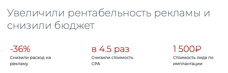 Средняя стоимость входящего звонка с рекламы снизилась в 4,5 раз с 13 000 до 1 545 руб по имплантации, где средний чек начинается от 50 000 рублей с работами