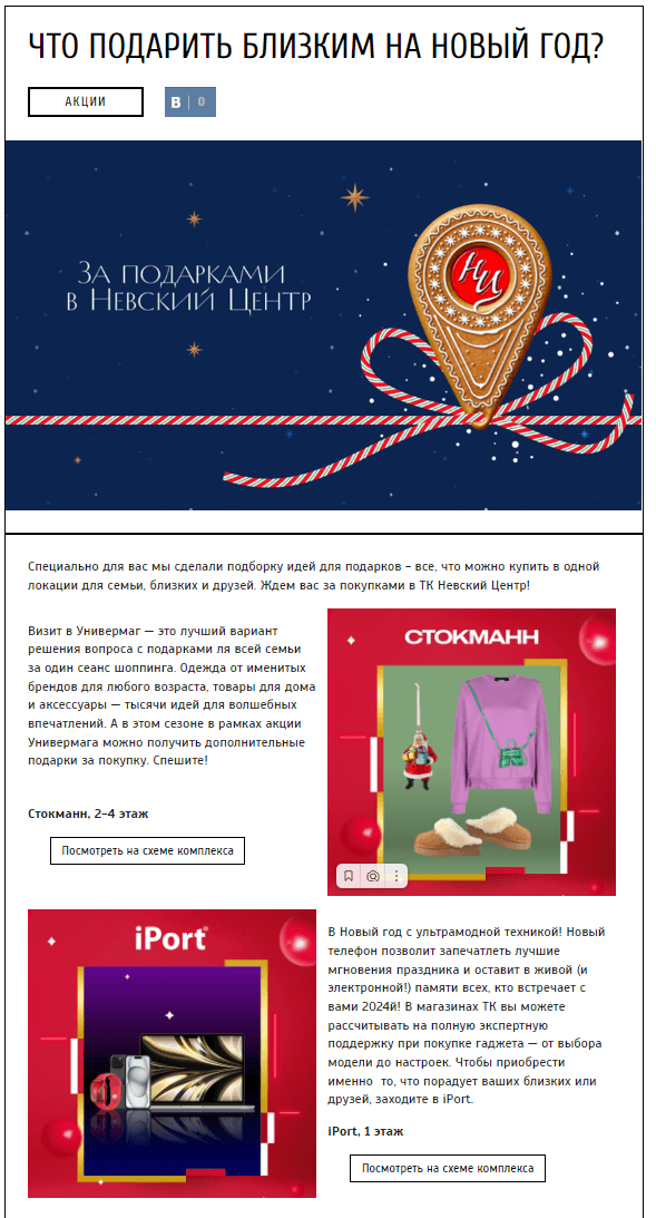 Торговый комплекс "Невский Центр", расположенный в центре Санкт-Петербурга, обратился к нам с запросом на усиление общей маркетинговой стратегии с использованием инструментов интернет-рекламы. Наша задача заключалась в привлечении новых посетителей в Торговый Центр и стимулировании их регулярных посещений.