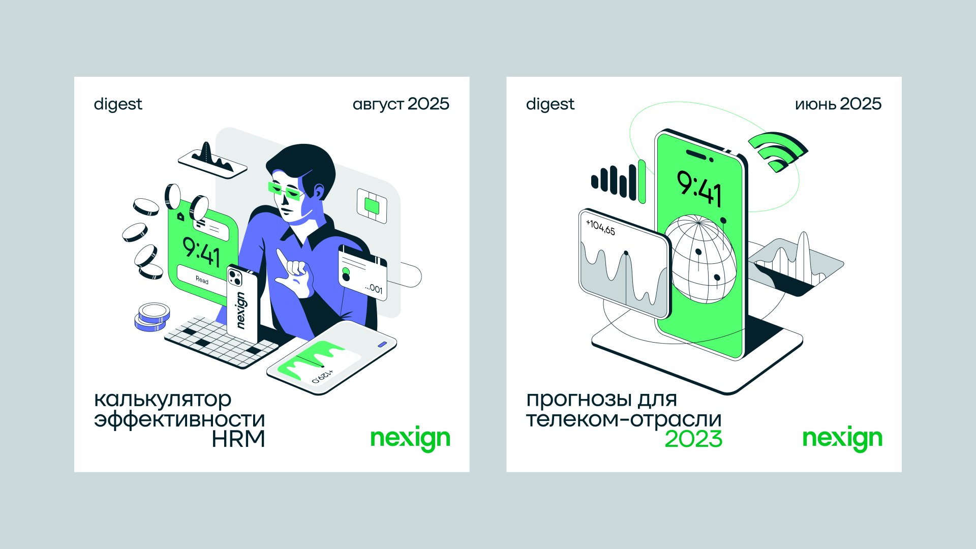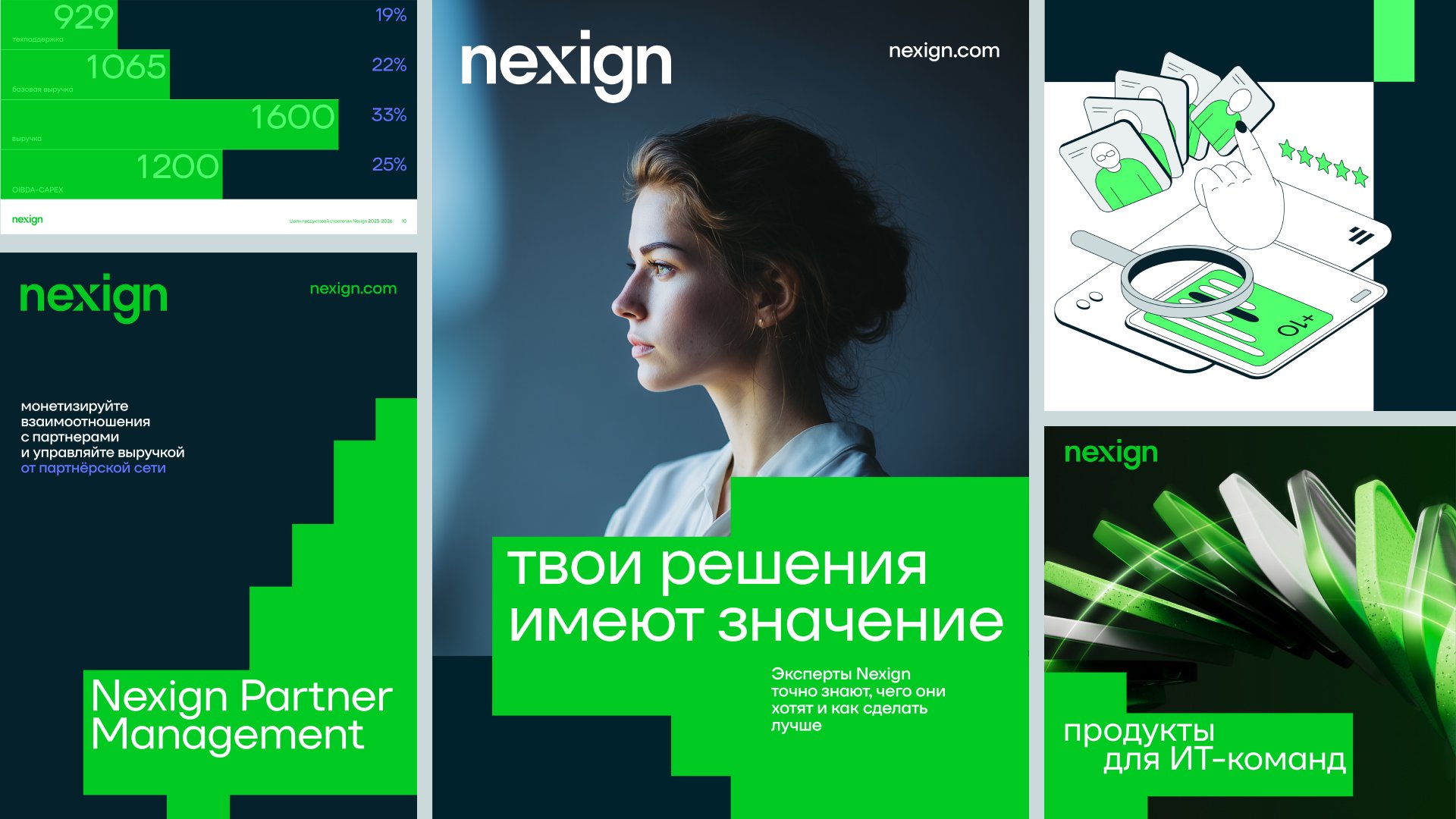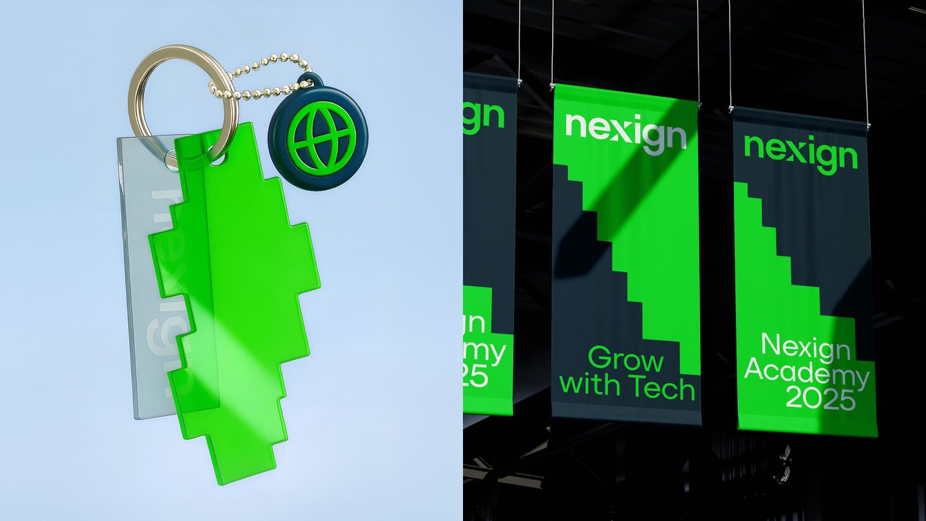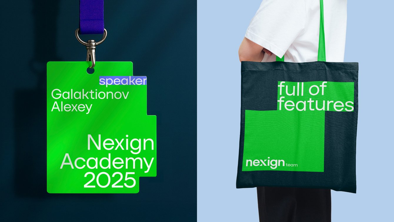 Фирменная графика Nexign поддерживает идею бренда и усиливает его узнаваемость в типовой визуальной среде телеком и IT. Она интегрируется с типографикой, 3D, иллюстрациями и фотостилем, выступая полноценным визуальным идентификатором наряду с логотипом и цветом.