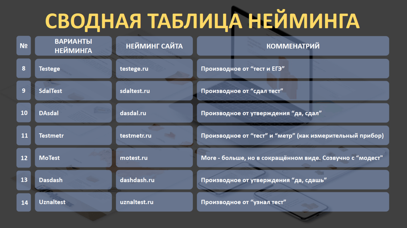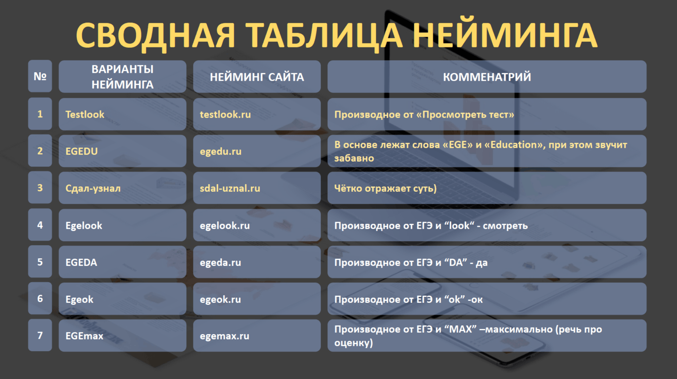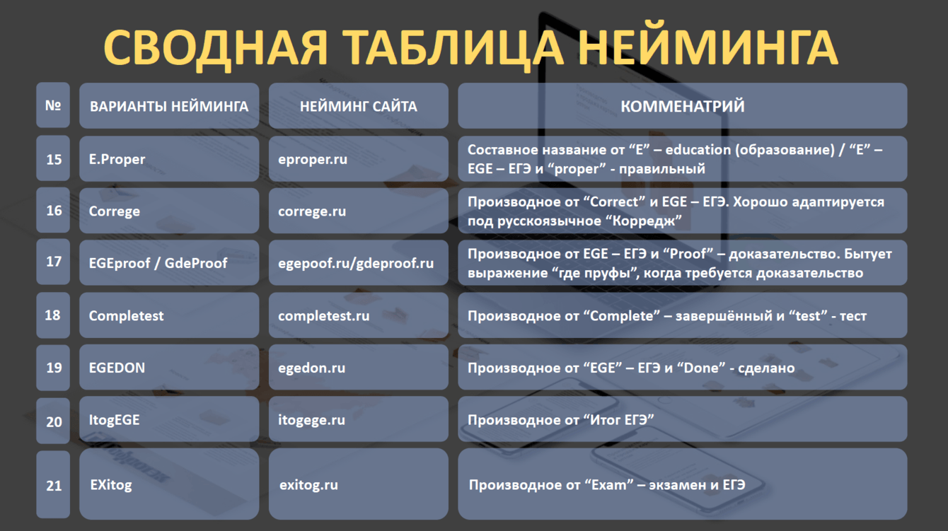 Сложность состояла ещё и в том, что наименование должно совпадать с будущим доменным именем сайта, а, следовательно, многие варианты отсекались по той причине, что доменное имя занято (несколько примеров ниже).