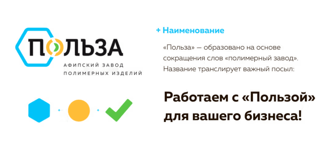Остановились на названии "ПОЛЬЗА". Оно выделялось среди наименований конкурентов, являлось аббревиатурой-анаграммой самого предприятия (Афипский ЗАвод ПОЛИмерных изделий), а также выгодно отражало позиционирование.