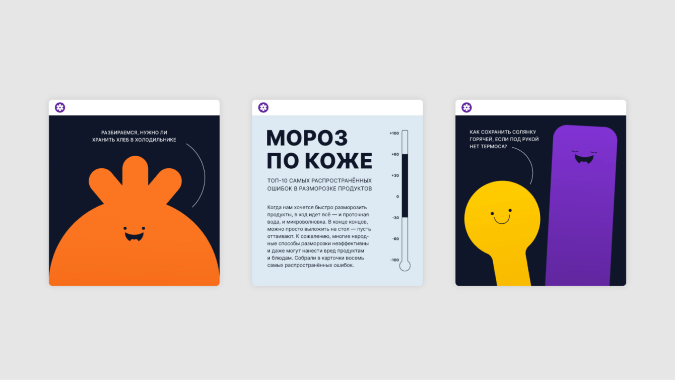 Мы предположили, что Termy может активно использоваться не только на упаковке, но и в коммуникациях. На такой случай продумали, что главный герой может принимать разные формы в зависимости от обстановки — покрываться инеем, подтаивать от жары или сохранять нейтральную шарообразную форму.