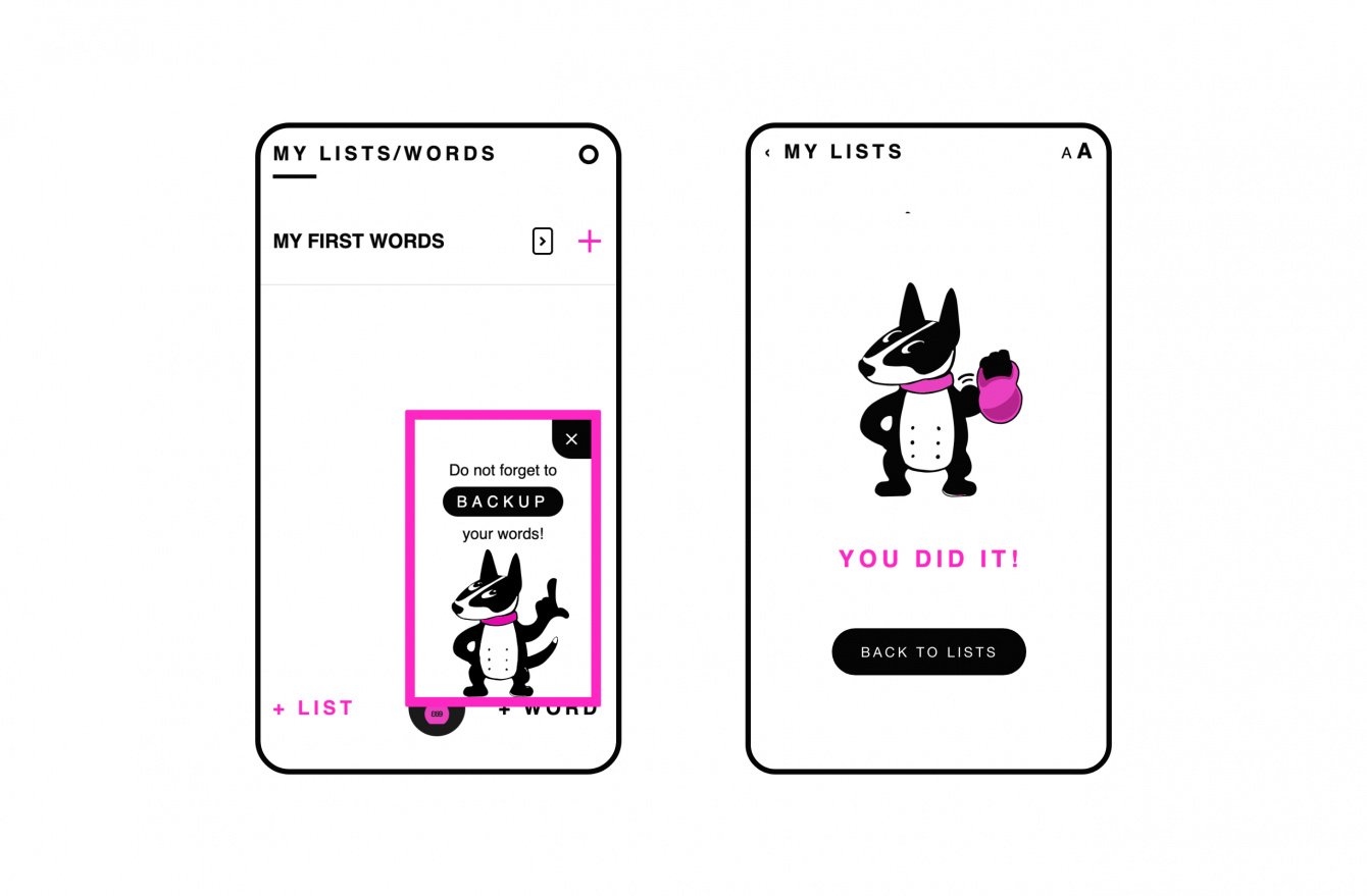Так как приложение про слово и текст, то его основа - черно-белая. Яркий розовый служит узнаваемости и акцентным деталям.