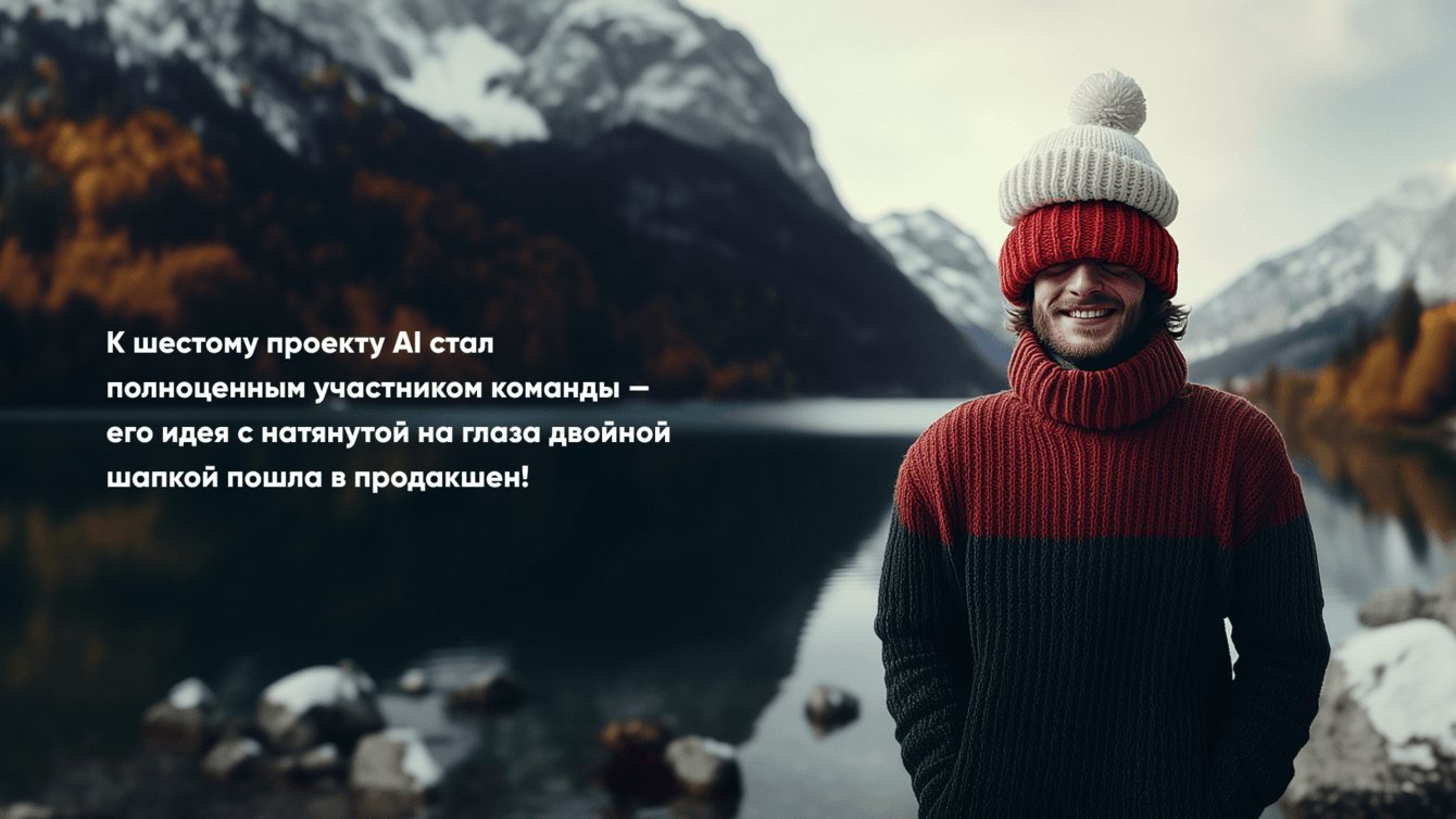 На третьей итерации у нас оказался вариант, сгенерированный нейросетью с двойной шапкой, натянутой на глаза. И это оказалось именно то, что нужно! Самое удивительное, что это случайная генерация, которая в итоге пошла в продакшен.