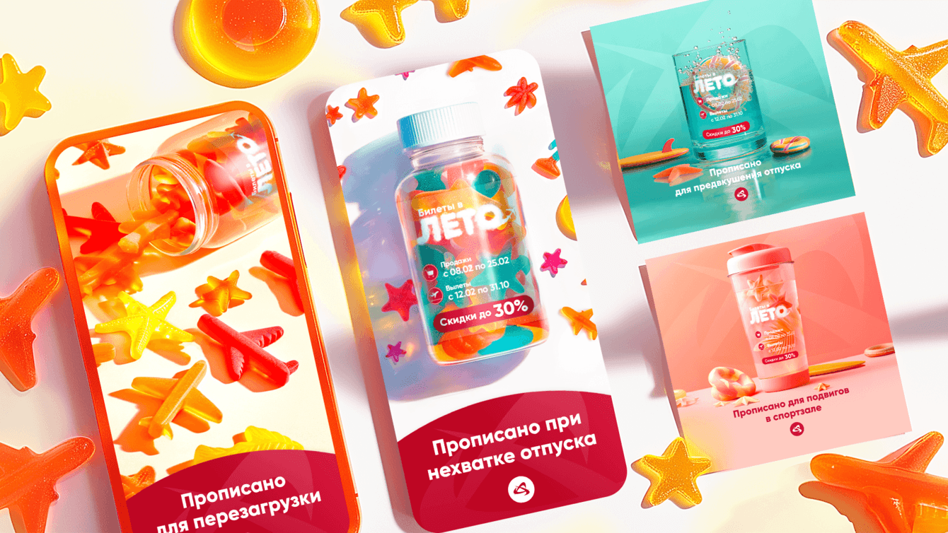 Для этой акции мы работали с концепцией «Прописано при нехватке отпуска». В качестве лечения от осенней хандры — мармеладные витамины в форме самолётов, пальм, серфбордов и морских звёзд. Чтобы создать идеальный мармеладный самолет и самые летние блики на банке, использовали только Midjourney и функцию Inpainting.