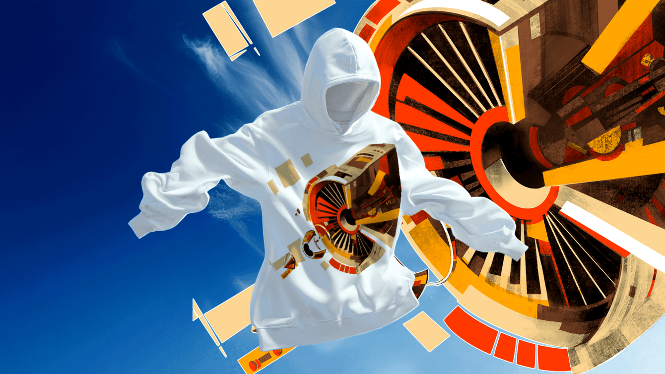 Кроме того, мы разработали принт для фирменного мерча — футболок, худи и шоперов — со стилизацией реального двигателя, который используется в самолётах парка Уральских авиалиний, тоже с использованием нейросетей.