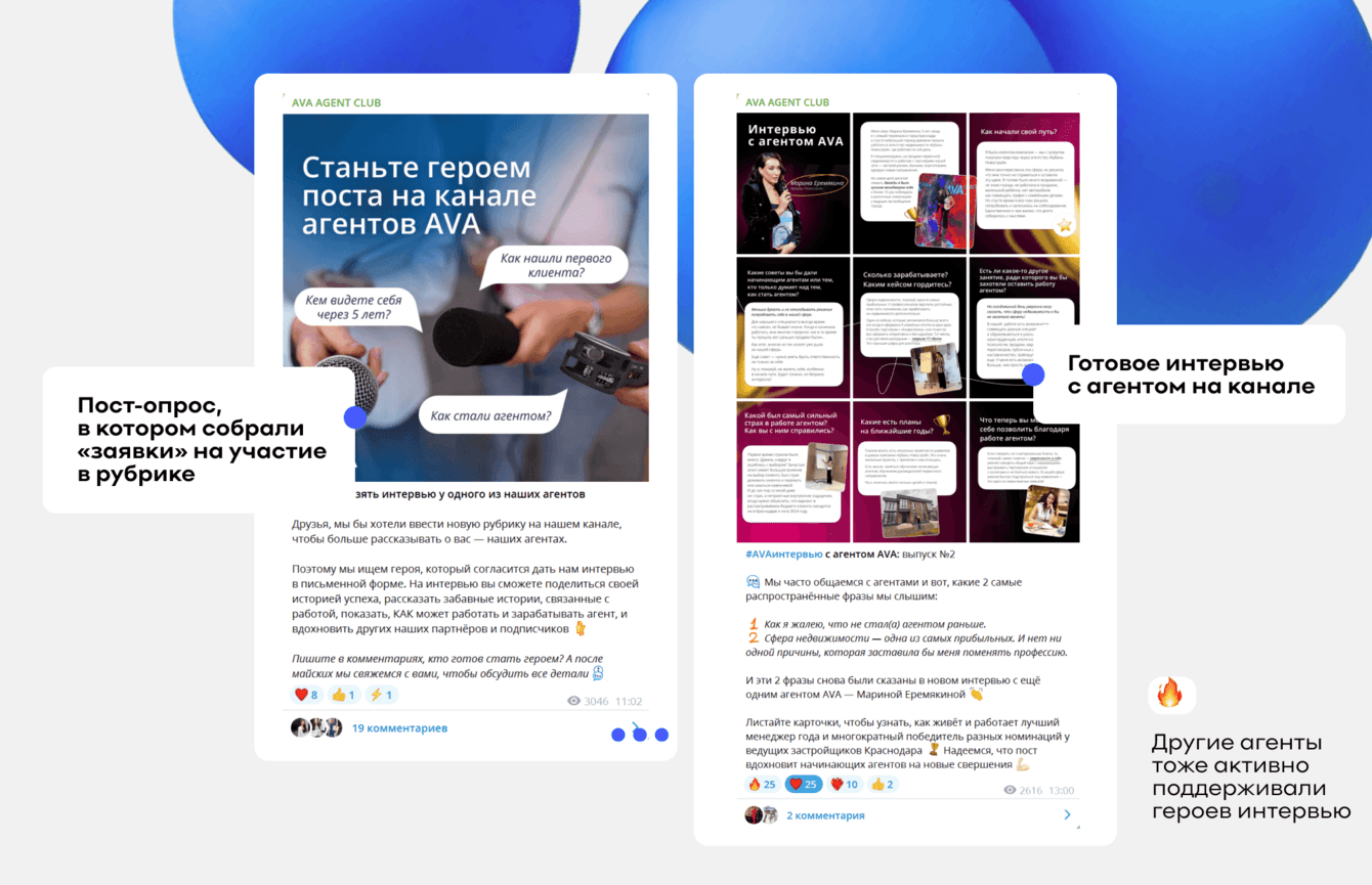Для начала сделали пост, в котором попросили отметиться агентов, которые хотят стать звездой канала. Так мы собрали 19 кандидатов и начали брать интервью по списку.