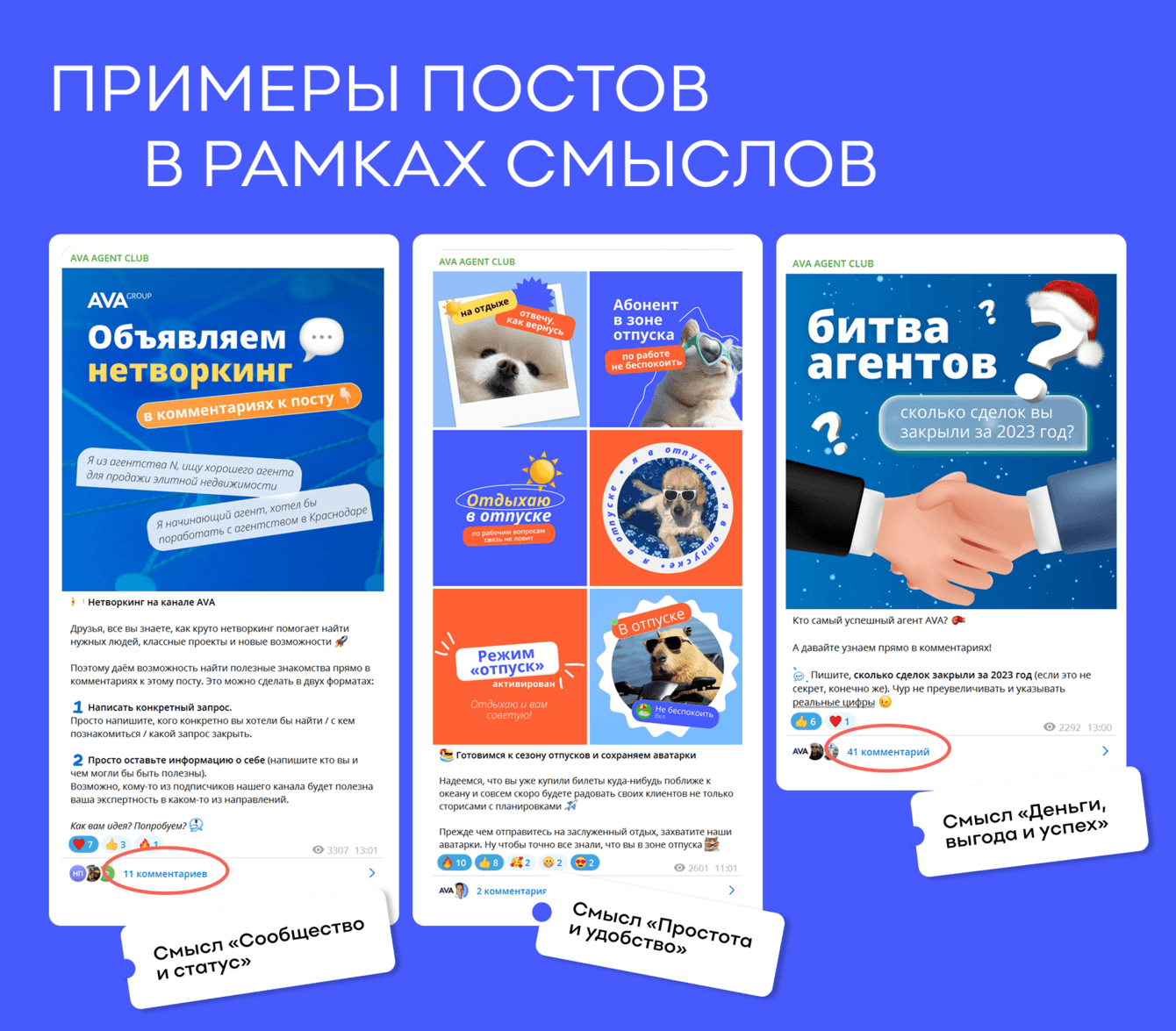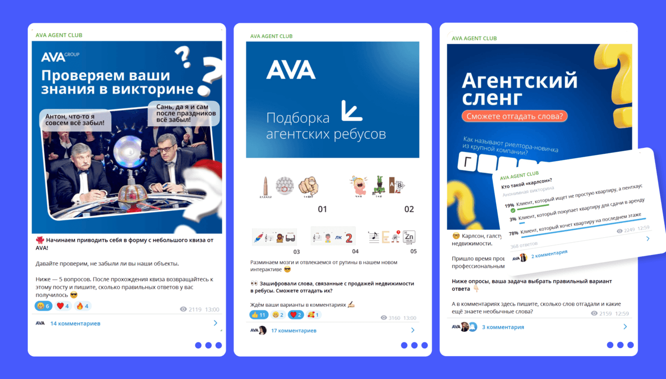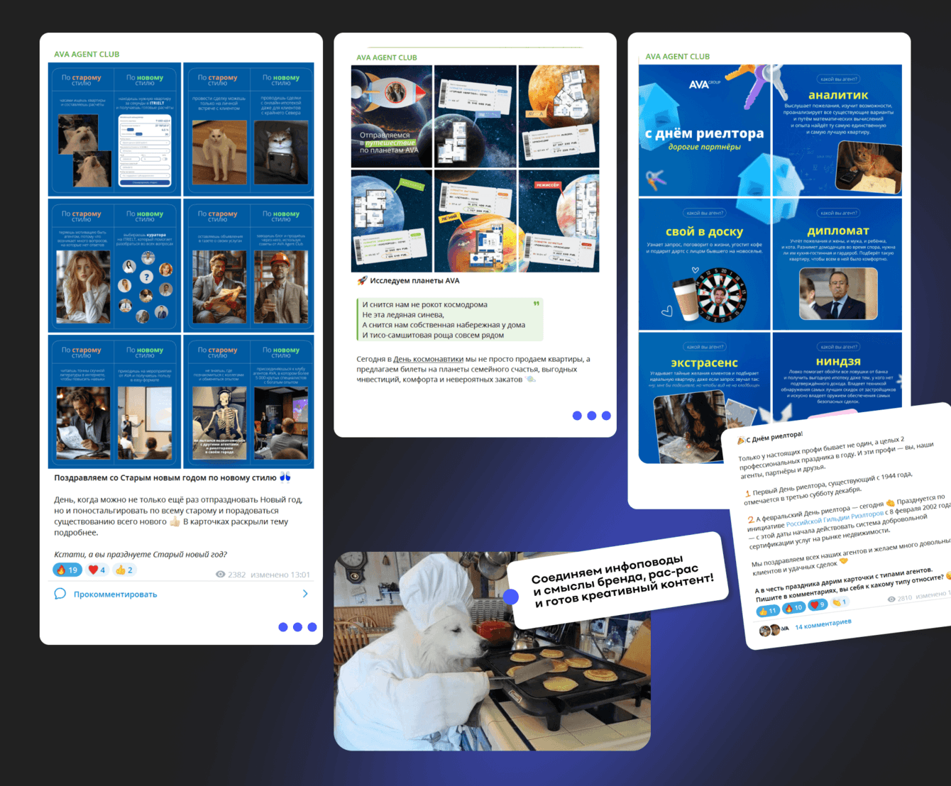 6. Через креативный копирайтинг создать дружелюбную и лёгкую атмосферу внутри канала, максимально стирая барьеры в общении между застройщиком и агентом. Создаём ассоциацию “канал для агентов AVA = друг, коллега и место, где есть мои единомышленники”.