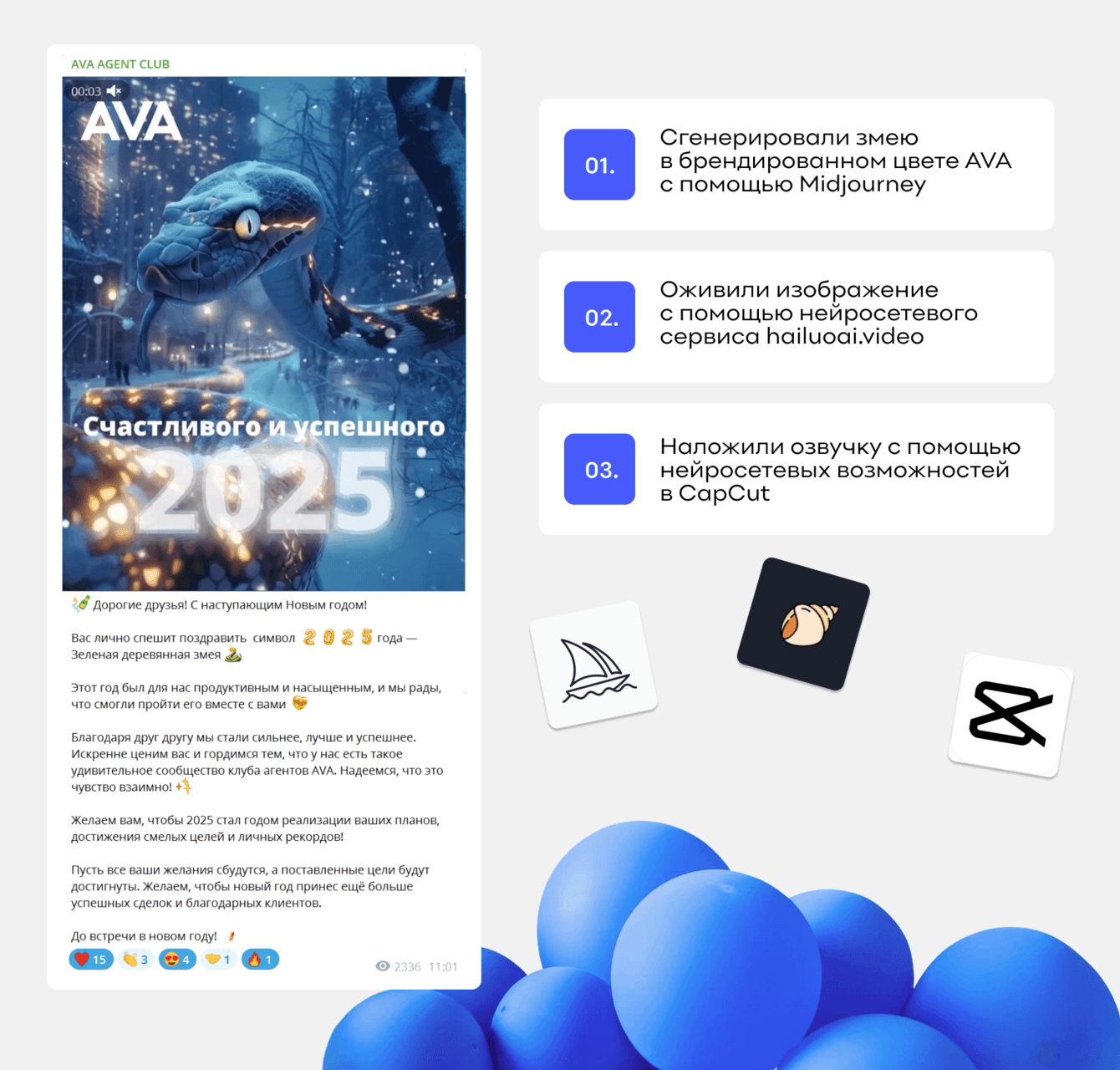 А в преддверии нового 2025 года мы привлекли целую команду нейросетей, чтобы сделать креативную новогоднюю открытку с символом года.