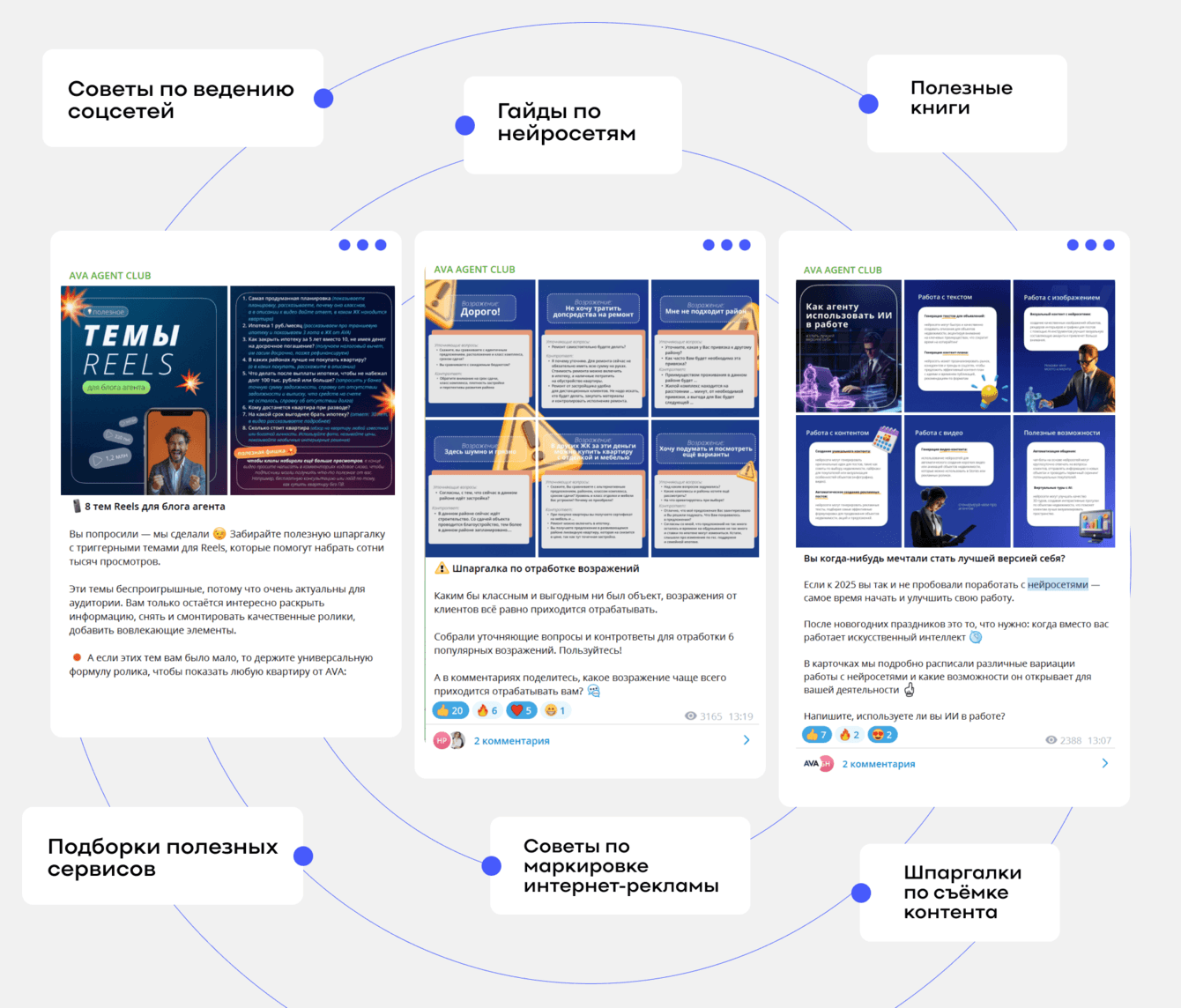 4. Полезные посты и эфиры от экспертов на тему продаж, использования нейросетей, развития личного бренда и соцсетей агента.
