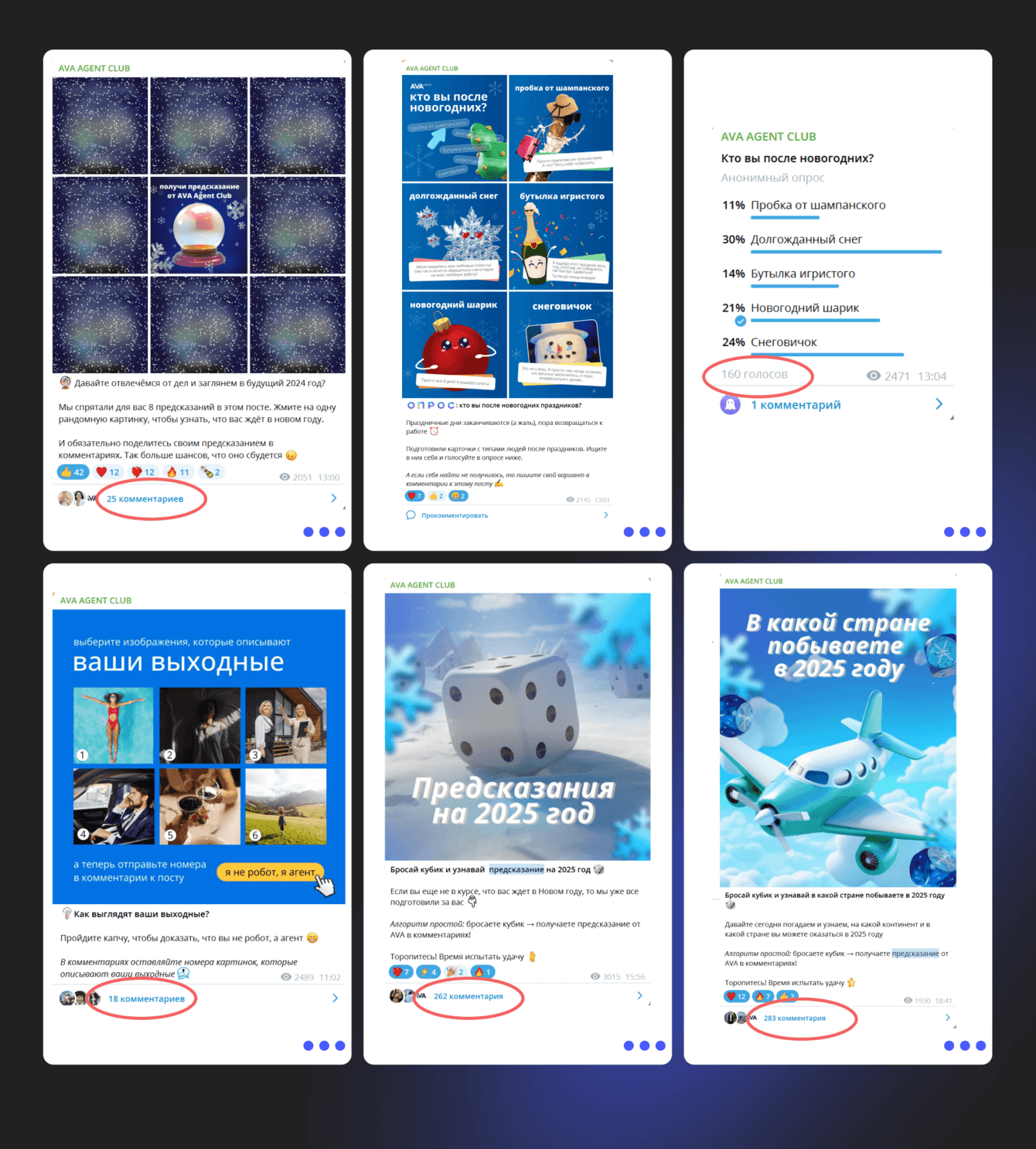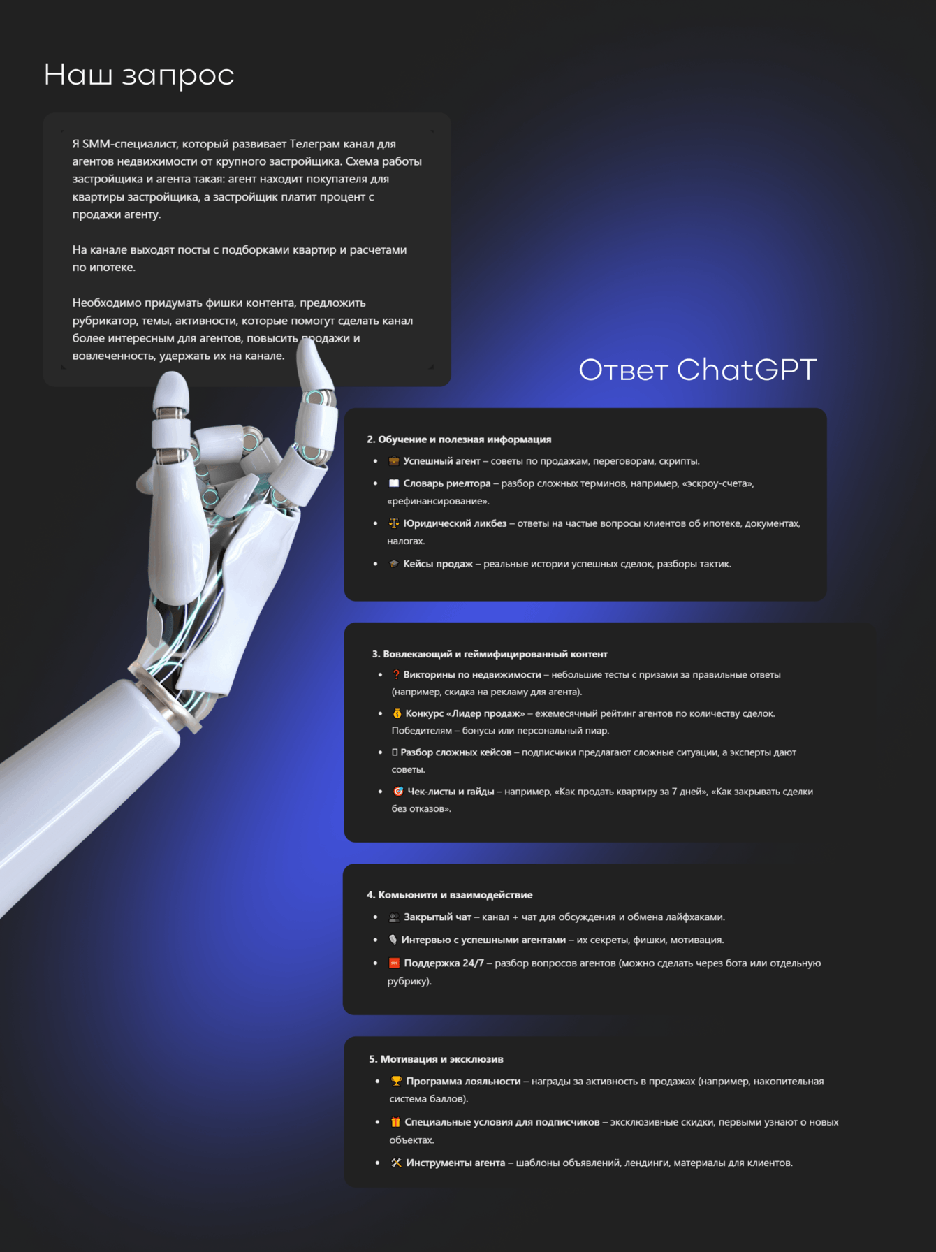 Конечно же, мы не могли не реализовать рубрику, предложенную ChatGPT. Эта рубрика нам очень откликнулась, так как не только давала возможность агентам самим поучаствовать в жизни канала и проявить себя, сделать вложение в контент, но и дала другим начинающим агентам мотивацию, готовые решения и вдохновение.