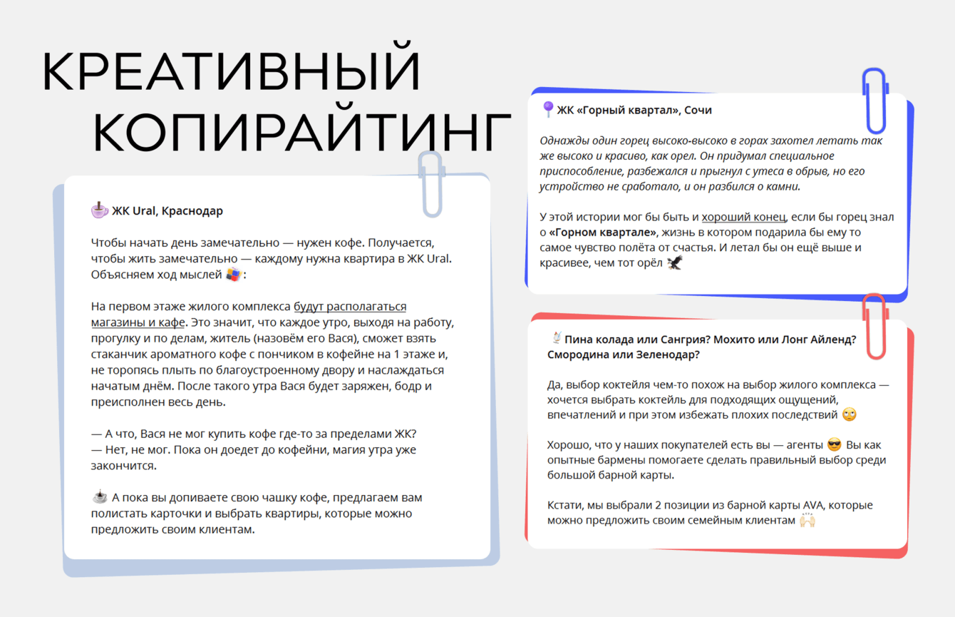 Тот случай, когда копирайтинг реально важен. Агенты — аудитория занятая, читать длинные и скучные тексты у них точно нет времени. А у нас ещё и стоит задача выделиться и создать сообщество, в котором агенты могут общаться на равных с застройщиком и удобно получать информацию для работы.