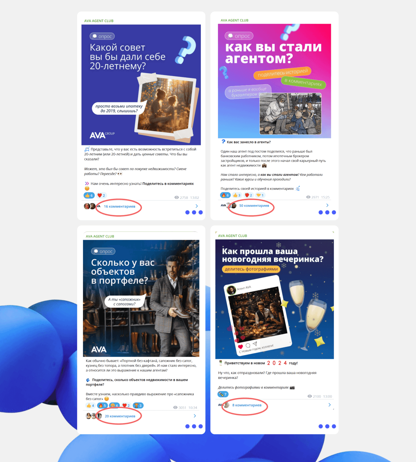 А для более глубокой проработки отношений с уже прогретыми агентами мы использовали более сложные опросы, в которых агенты уже могли проявить себя: просили делиться фотографиями с новогодней вечеринки, рассказать про профессию до прихода в сферу и многое другое.