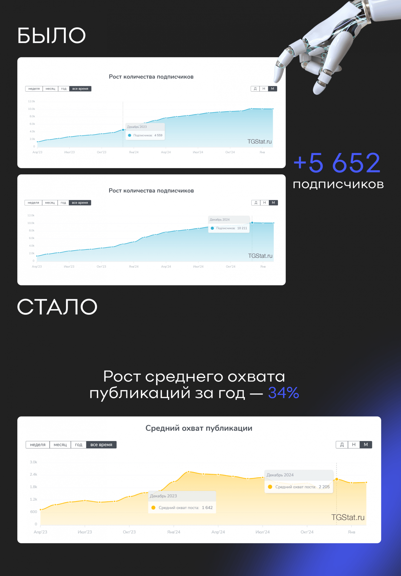 Последняя тема стала настоящим фурором на канале, эфиры по нейросетям стабильно собирали на 20% больше зрителей, чем другие темы.