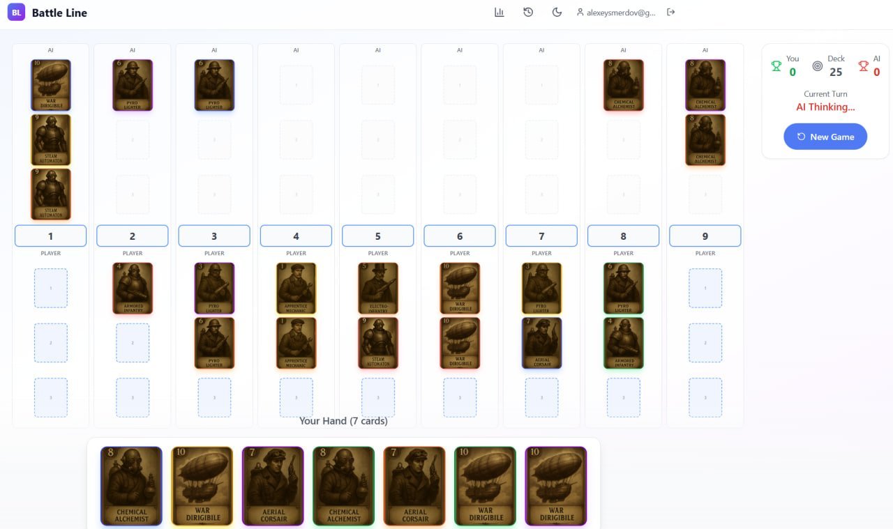 Создать браузерную реализацию настольной игры Battle Line, адаптированную для одиночной игры против ИИ и для двух игроков по сети. Игра должна поддерживать все правила оригинала: девять флагов, комбинации карт по силе, логика захвата флагов и подсчёт победных линий.