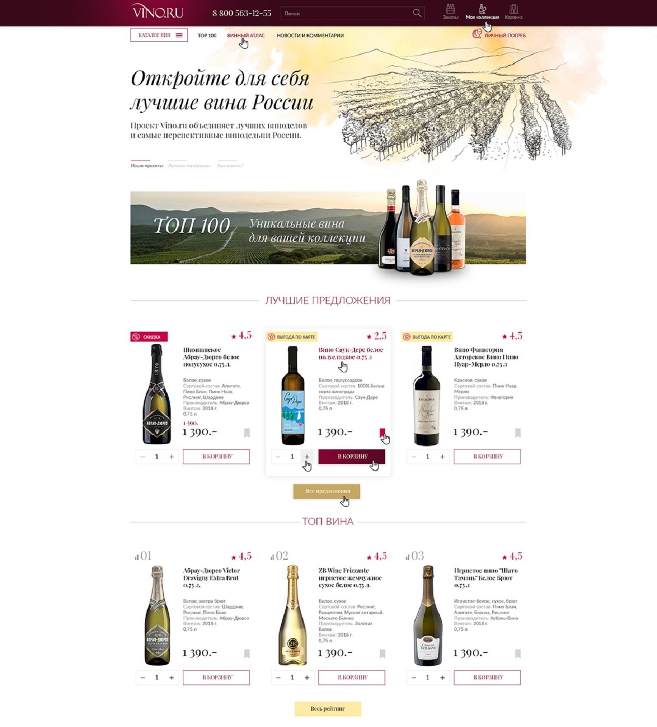 Рамках создания маркетплейса на проекте реализованы личные кабинеты поставщиков для загрузки номенклатуры, реализованы информационные разделы: карта российских виноделен, дорабатывается концепция Рейтинга Топ-100 российских вин, созданы и наполняются редакцией новостная и статейная рубрика для экспертных материалов.