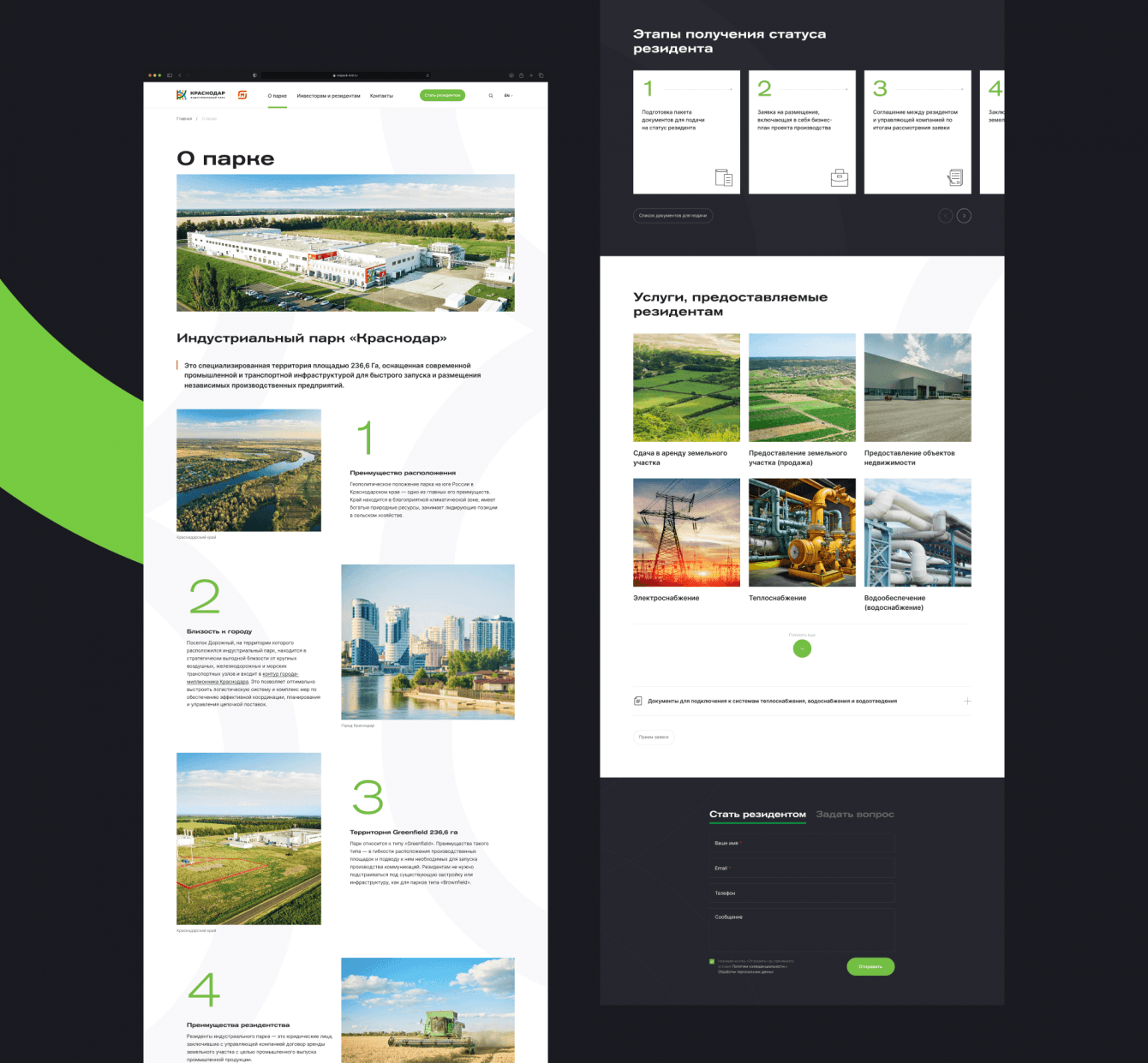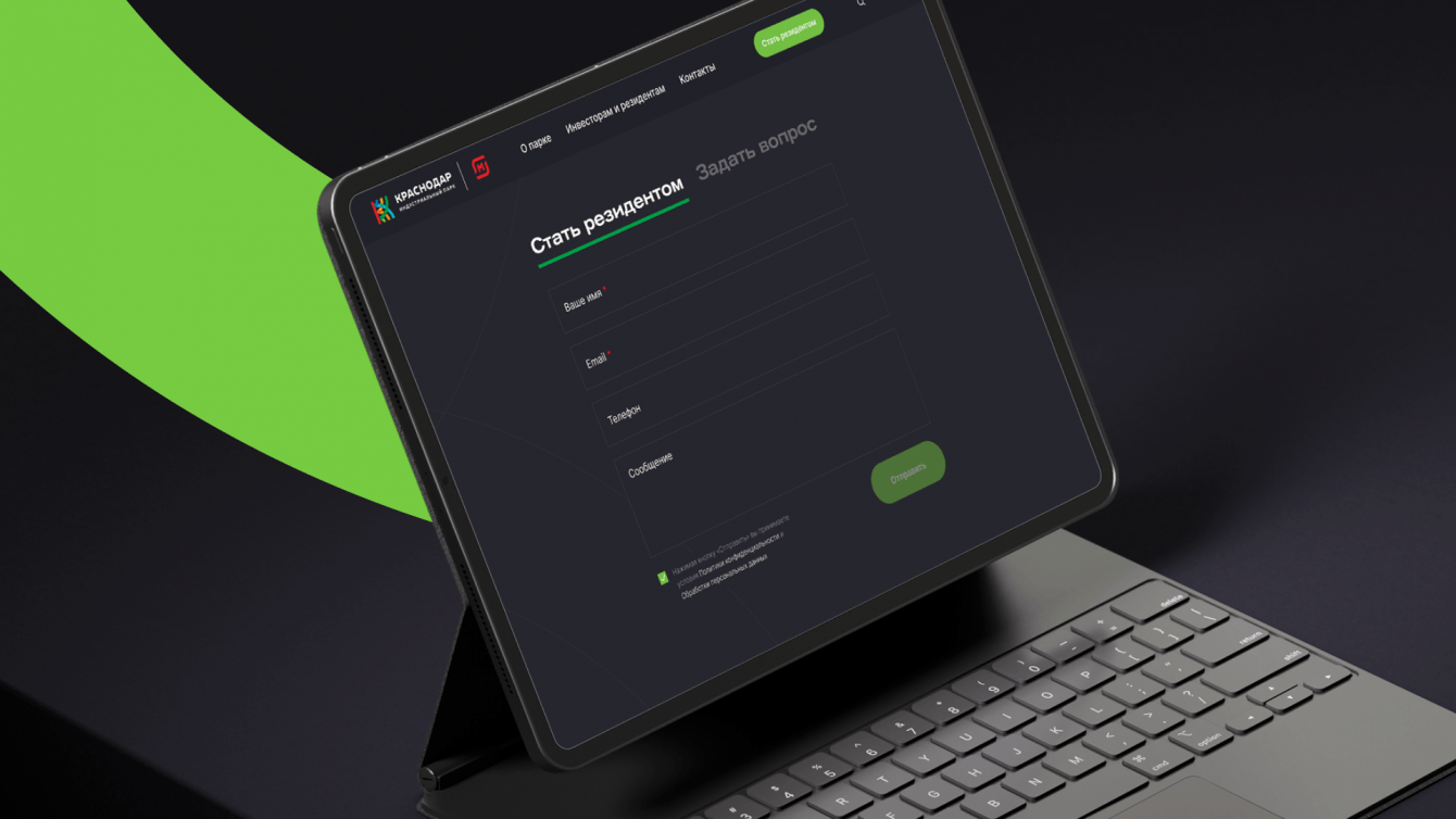 Особое внимание уделили форме обратной связи, разделив ее на две вкладки — для вопросов и для заявок. Так пользователи могут получить необходимую информацию о парке без необходимости сразу же подавать заявку на резидентство, а заказчик не теряет потенциальных клиентов на этапе заполнения жесткой формы заявки.