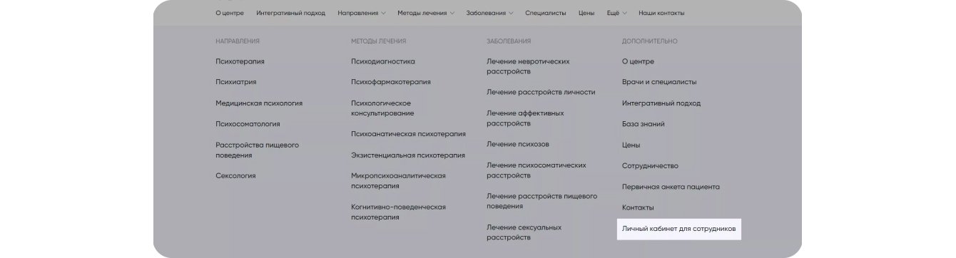 1 Основные разделы: «О центре», «Интегративный подход», «Направления», «Методы лечения», «Заболевания», «Специалисты» и «Цены».