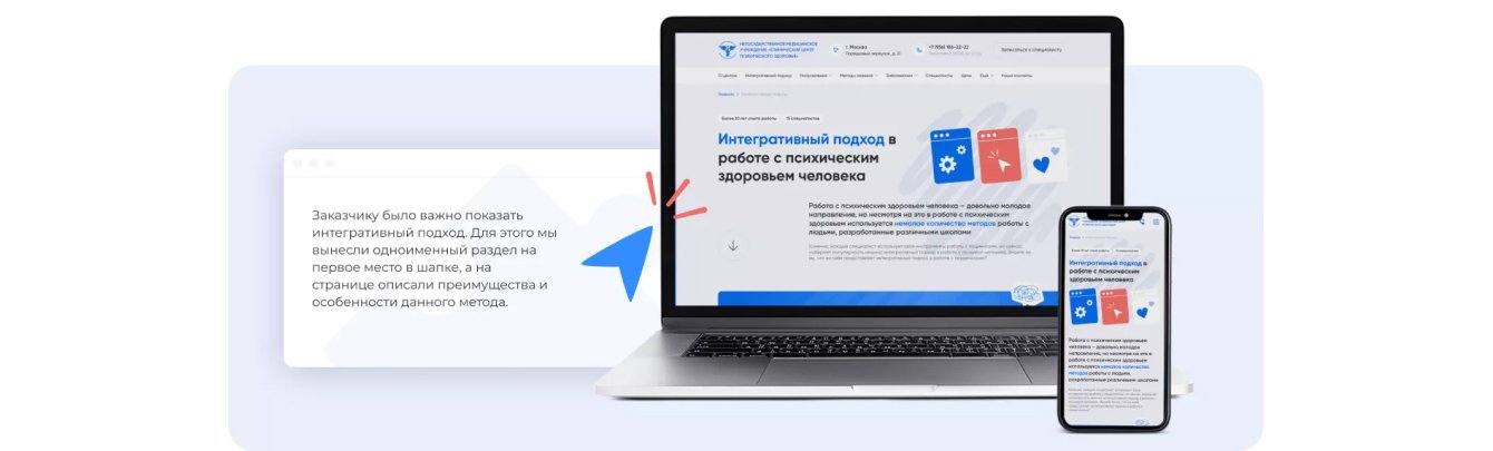 Клиент хотел, чтобы ресурс удерживал внимание пользователя, давал понять человеку, что он в надежных руках и может довериться специалистам клиники. Далее мы расскажем о том, что было реализовано в рамках проекта.