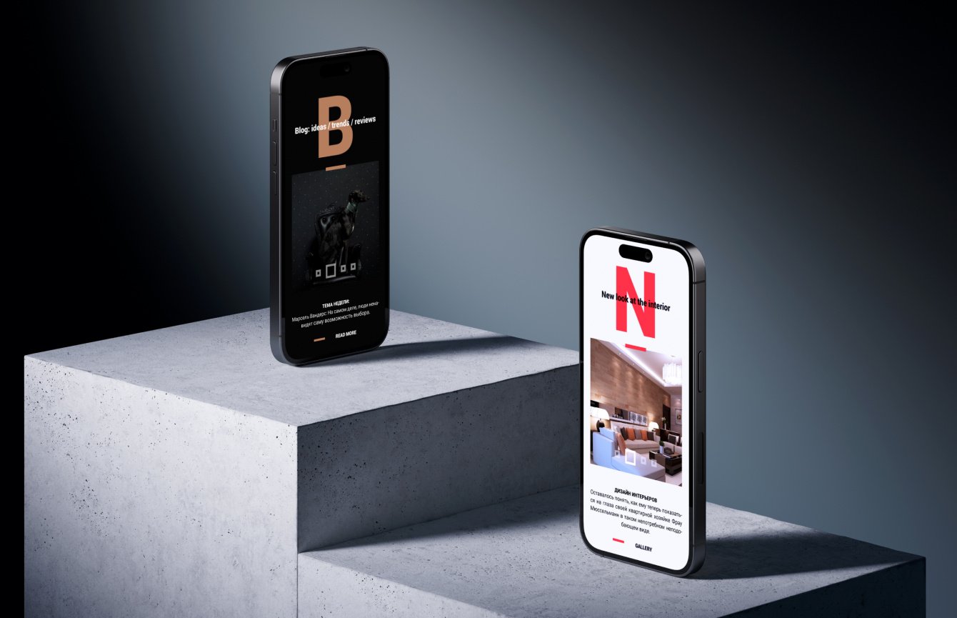 Мы решили реализовать дизайн проекта с акцентом на изображениях из портфолио заказчика, сделав главным героем сайта именно работы нашего клиента. Минималистичный текст, гипер–графика из заглавных букв названия бренда и большие изображения реализованных проектов.