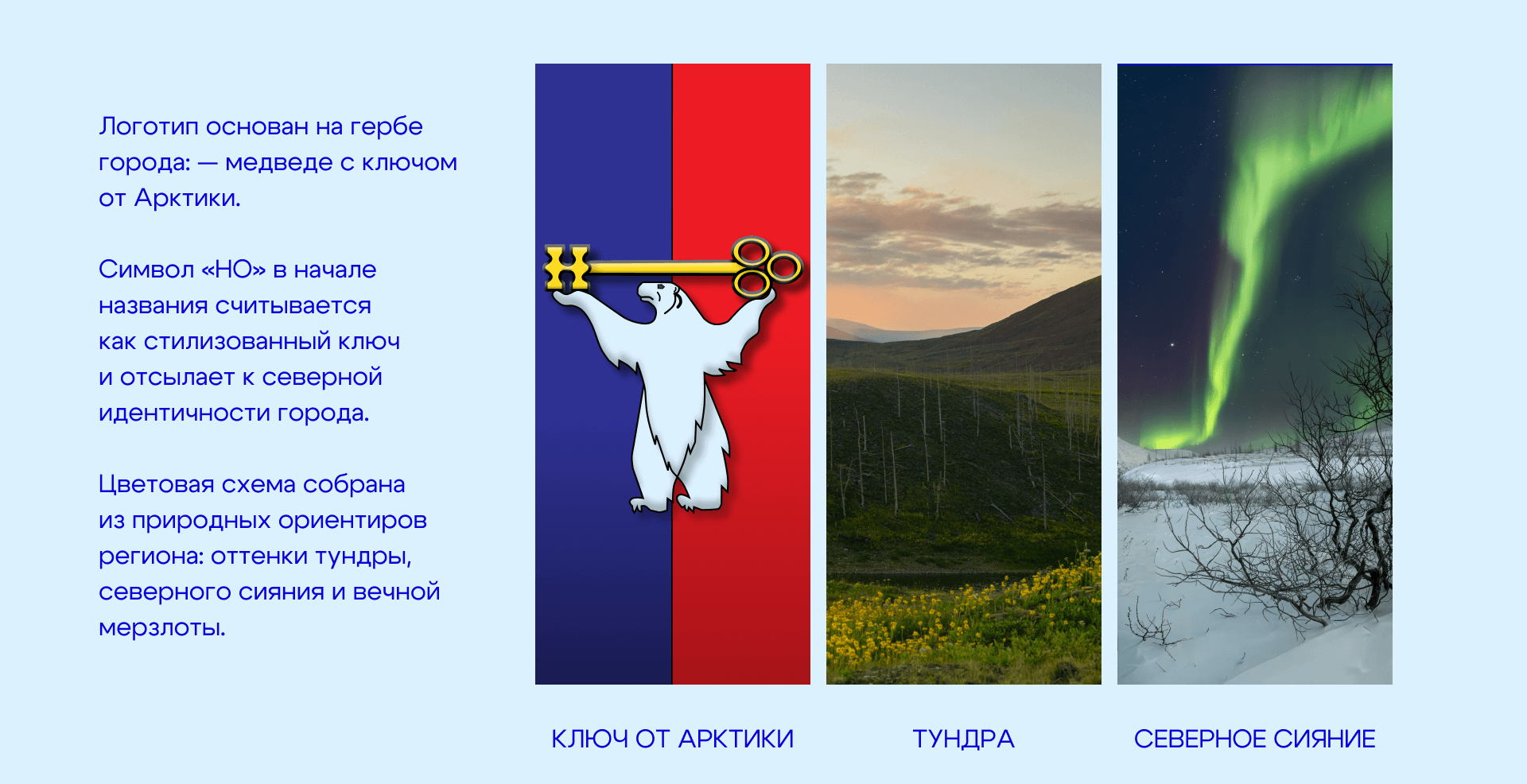 Цветовая схема собрана из природных ориентиров региона: оттенков тундры, северного сияния и вечной мерзлоты.