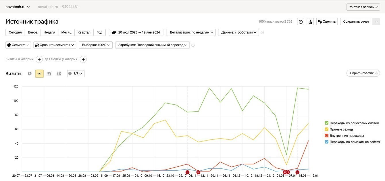 Уже через 2-3 недели после запуска и первичной индексации поисковыми системами, на сайт стали приходить пользователи. Тренд посещения растущий (спад только на новогодних праздниках – это нормально)