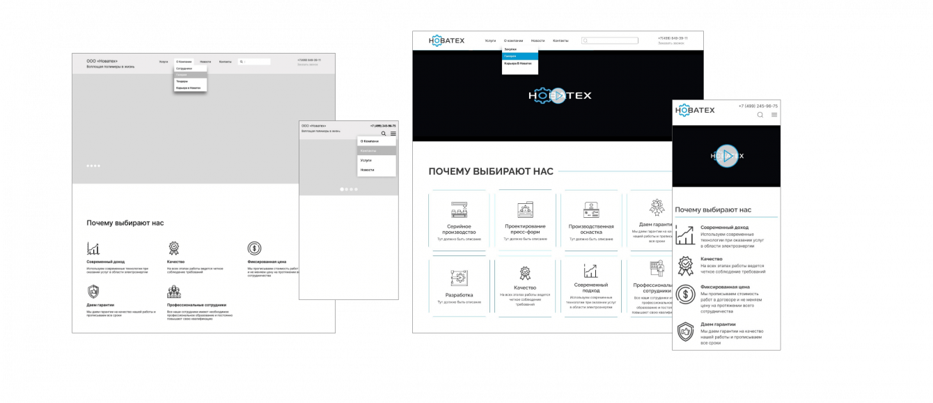 Компания Новатех пришла к нам за тем, чтобы их будущий сайт смог подсветить все циклы производства, все что они могут предложить рынку, а также чтобы через сайт можно было оформлять заказы на услуги, используя специальные формы обратной связи для каждого раздела свои.