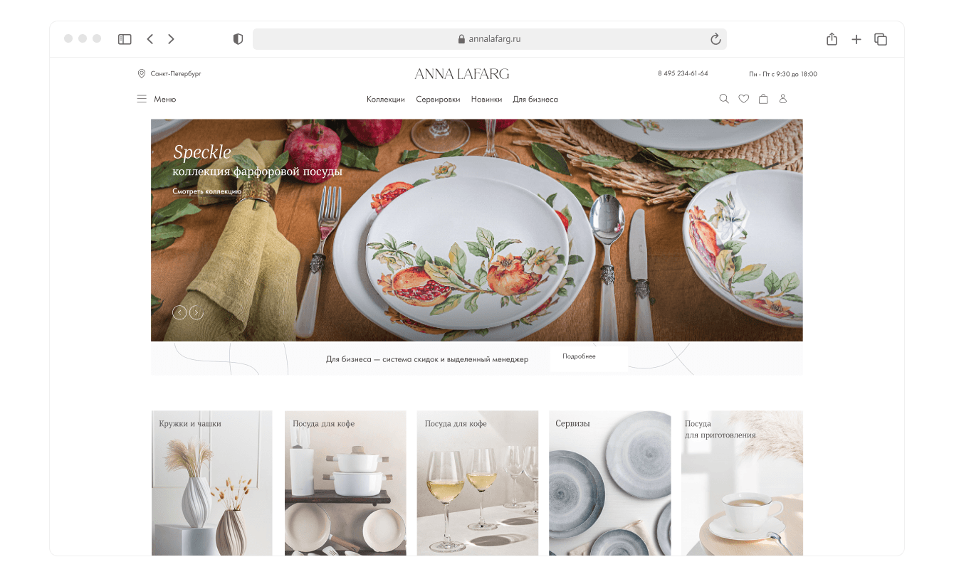 Бренд Anna Lafarg работает на территории России и стран СНГ с 1998 года. За это время компания выросла в одного из крупнейших оптовых продавцов посуды, подарков и предметов интерьера. Ассортимент включает как функциональные предметы для сервировки и кухни, так и интерьерные аксессуары. Клиенты бренда — оптовые покупатели, розничные сети и частные ценители красивого дома.