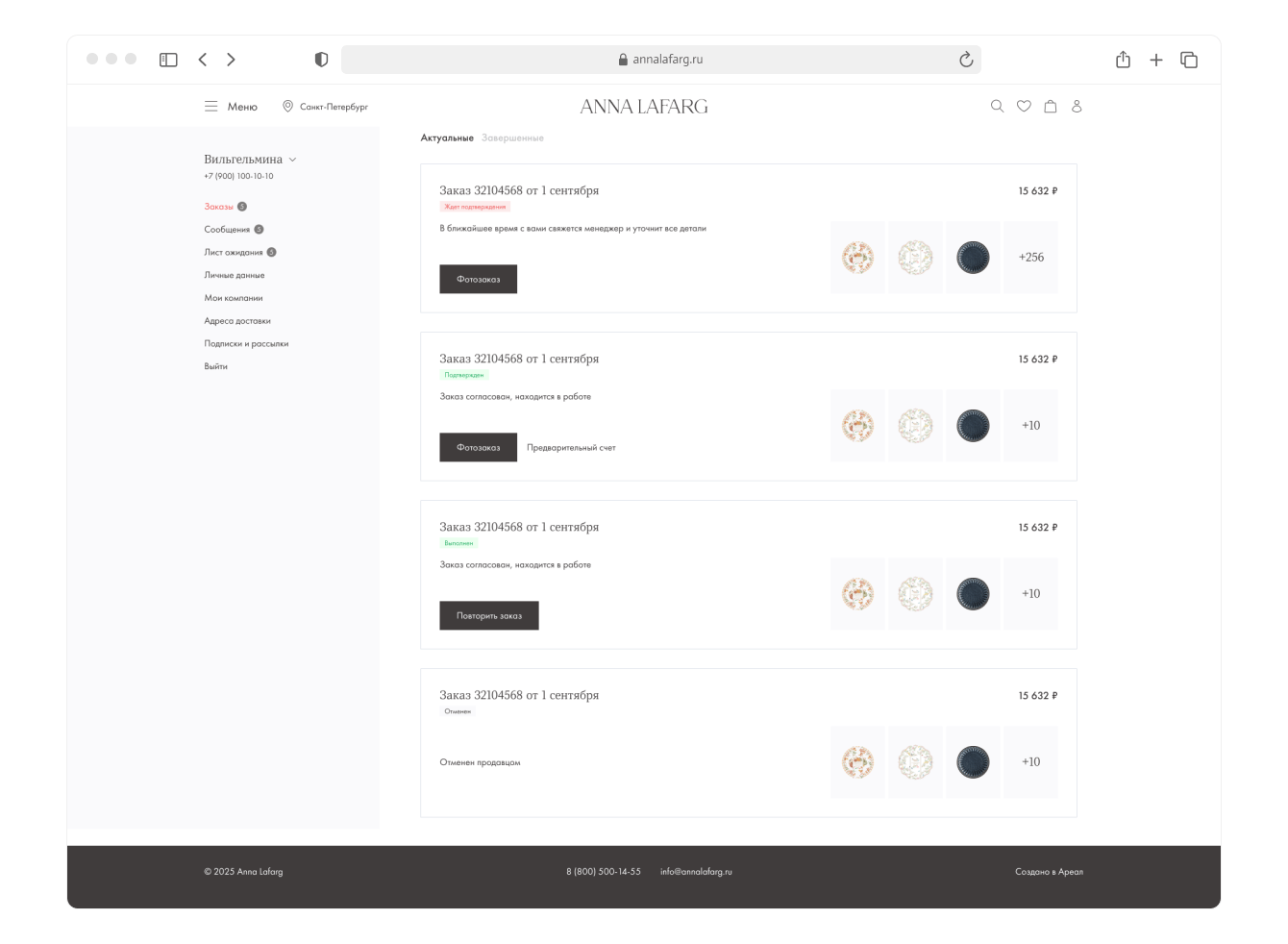— История заказов. Все прежние заказы распределились по личным кабинетам на основе e-mail. Там, где артикулы товаров совпадают с новой базой, позиция кликабельна. Если продукт снят, выводится превью без ссылки.
