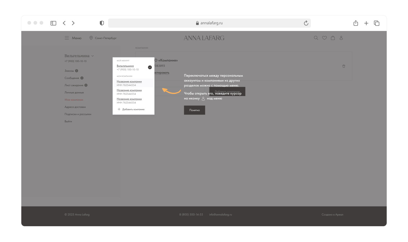 Для оптовиков реализована гибкая система регистрации: создание профиля компании, выбор персонального менеджера. При необходимости пользователь может привязать несколько компаний к своему аккаунту и переключатся между ними без выхода из кабинета.