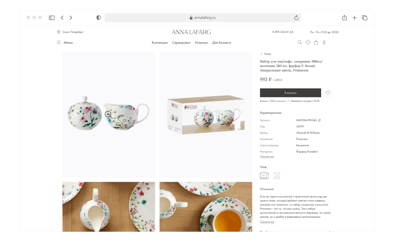 Каждую коллекцию или сервировку можно добавить в избранное, как готовую подборку товаров. Каталоги и тематические подборки контент-менеджеры создают в «Битрикс». «Коллекции» и «Сервировки» собираются как промо-разделы.